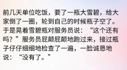 于是晃着雪碧瓶对服务员说:“这个还有吗?” 服务员接过瓶子仔仔细细地检查了一遍,一脸诚恳地说:“没有了。”