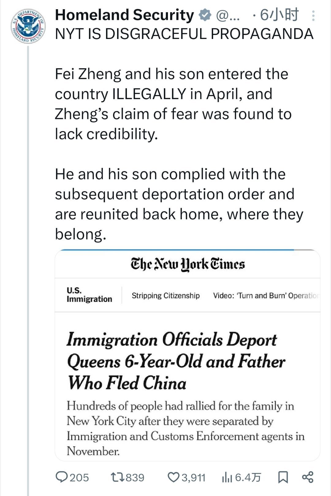6岁中国男童成最年幼遣返者之一 纽约时报洗地挨美国国土安全部批评曾一度引发网络广泛热议的纽约中国父子,已被美国移民当局遣返原籍。事件中最受关注的,是年仅6岁的中国男童郑元鑫——他被认为是近年来在纽约地区被拘留、并最终遭遣返的最年幼无证非法移民之一。美国媒体报道,今年4月,6岁的郑元鑫跟着父亲郑飞经墨西哥非法入境美国,被边境巡逻队发现拘留,后续被释放之后到了纽约皇后区。11月26日,郑飞带着儿子前往曼哈顿联邦广场26号的移民及海关执法局(ICE)总部进行例行报到时被拘留。郑飞随后被转送至纽约州橙县的成人拘留中心,6岁的郑元鑫则被单独带走,移交给负责安置“无陪伴移民儿童”的联邦难民安置办公室(ORR)单独管理。美国国土安全部发言人特里西亚·麦克劳林通过邮件向记者证实,这个家庭已于12月17日被遣返回原籍,并称“很高兴报告我们能够将该家庭遣送回国”。郑飞的朋友珍妮·斯佩克特透露,郑飞在被遣返前两天表示,他最终选择服从遣返令,是为了尽快与儿子团聚。美国国土安全部批评《纽约时报》,称《纽约时报》是可耻的舆论宣传。郑飞及其子今年四月以非法方式入境,其所谓恐惧之说辞被证实不可信。父子二人已遵从后续的遣返令回到家乡,在属于他们的地方团聚。