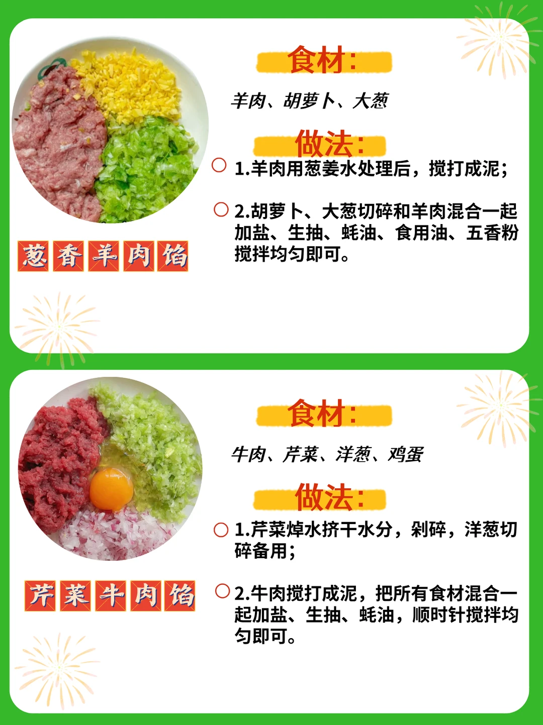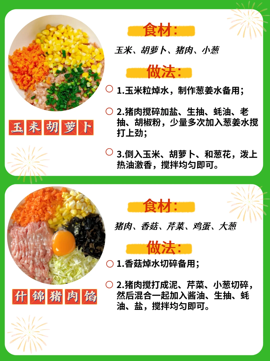 🌈今天把压箱底的万用饺子馅再分享一次,16种配方,有荤有素,嫩而不柴,每种都好吃哦😋,赶快安排起来吧❤️ 具体做法如图⬆️