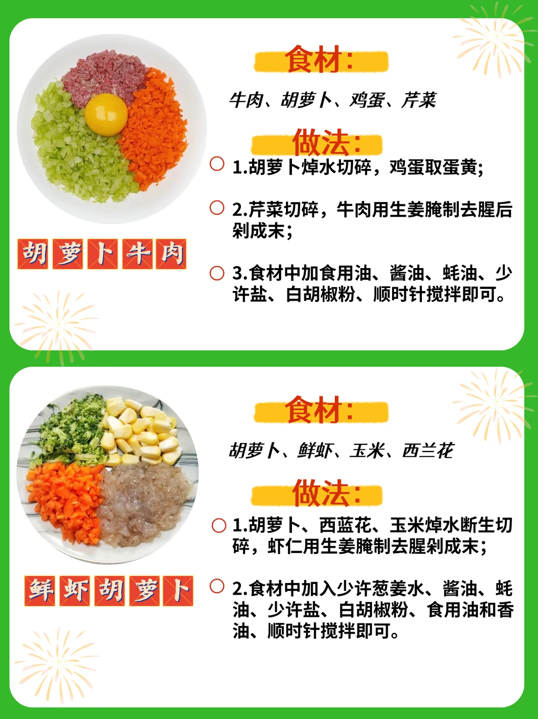 ⚠️小贴士:一岁以下的宝宝不要这么多调味料调味哦!食材打碎些,可以加些虾皮粉、猪肝粉、香菇粉等。
