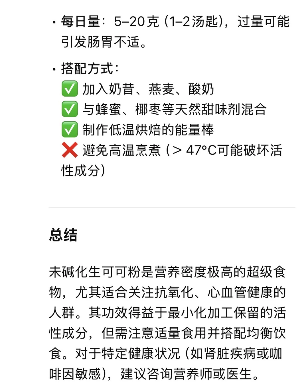 太好喝了,找到了小时候第一次喝高乐高的感觉! 这两天每天早起奔波,皮质醇爆表了,一整天都很疲惫、烦躁、水肿,随便吃点碳水血糖就很高。低碳又进一步提高了皮质醇,陷入了恶性循环。 于是下单买了一盒未碱化的可可粉,又好喝又降皮质醇的东西谁不爱呢?一打开盖子也太香了!小猫咪凑过来闻个不停。放温牛奶里搅拌搅拌,这不就是小时候喝的高乐高吗😍 一定要认准是未碱化的生可可粉,高温碱化会破坏可可中的活性成分,营养也会大打折扣。找了半天找到这款碳水含量非常低的生可可粉,糖前患者也可以放心喝。