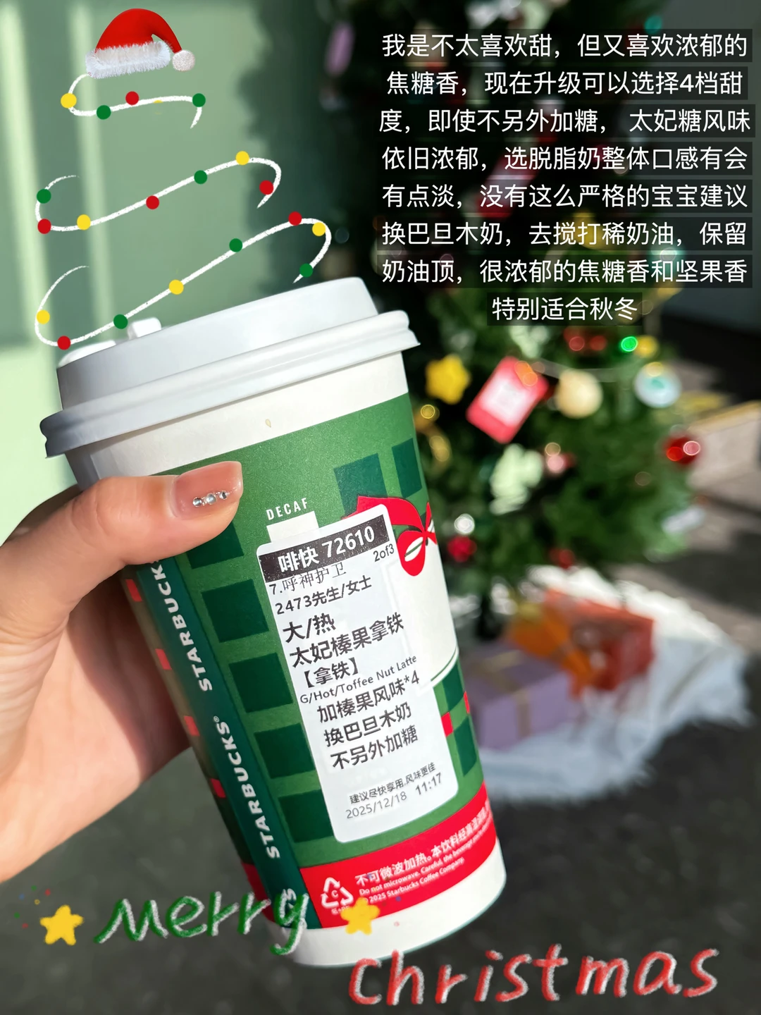 我是不太喜欢甜,但又喜欢浓郁的焦糖香,现在升级可以选择4档甜度,即使不另外加糖, 太妃糖风味依旧浓郁,选脱脂奶整体口感有会有点淡,没有这么严格的宝宝建议换巴旦木奶,去搅打稀奶油,保留奶油顶,很浓郁的焦糖香和坚果香,特别适合秋冬