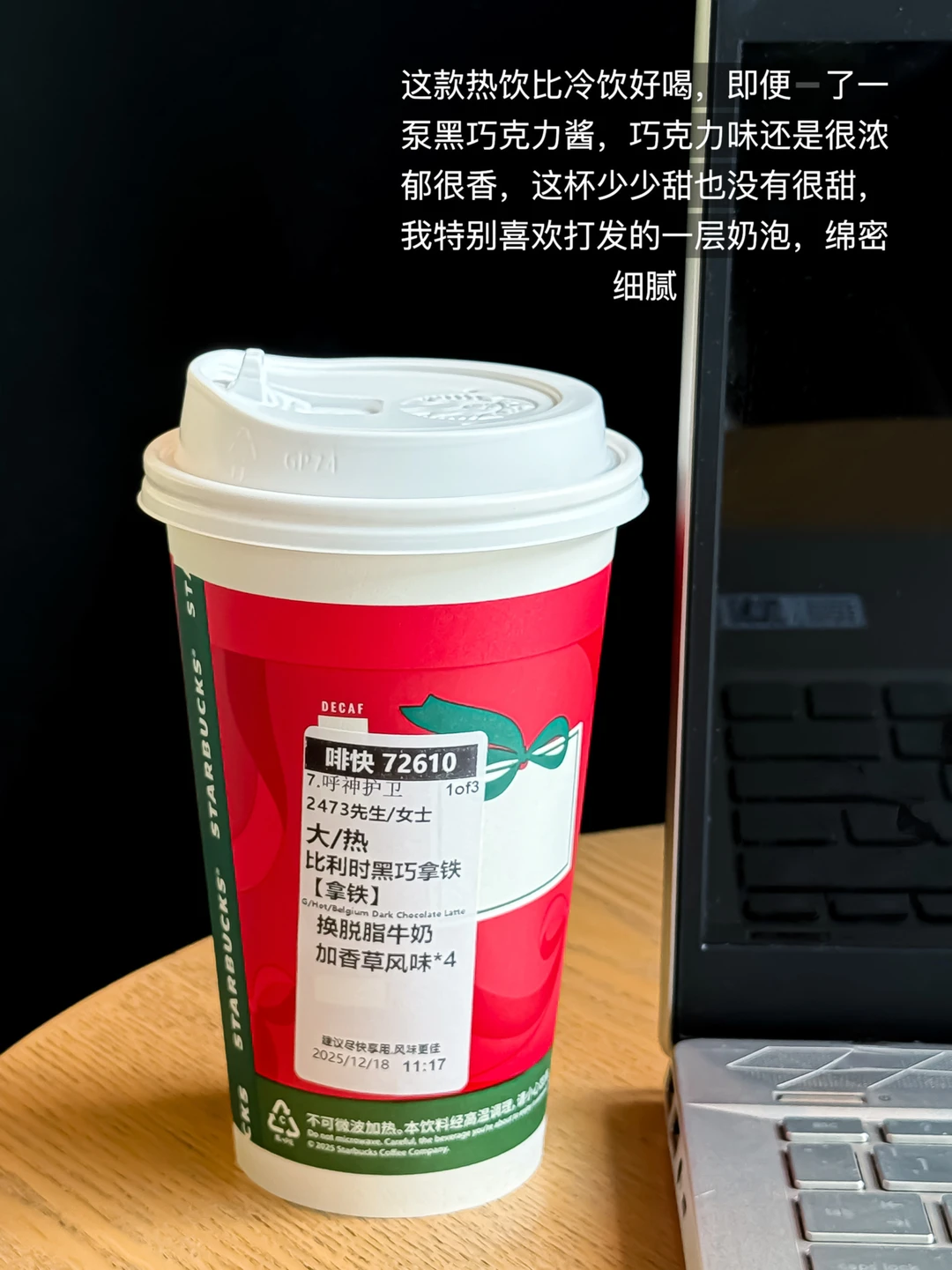 这款热饮比冷饮好喝,即便➖了一泵黑巧克力酱,巧克力味还是很浓郁很香,这杯少少甜也没有很甜,我特别喜欢打发的一层奶泡,绵密细腻