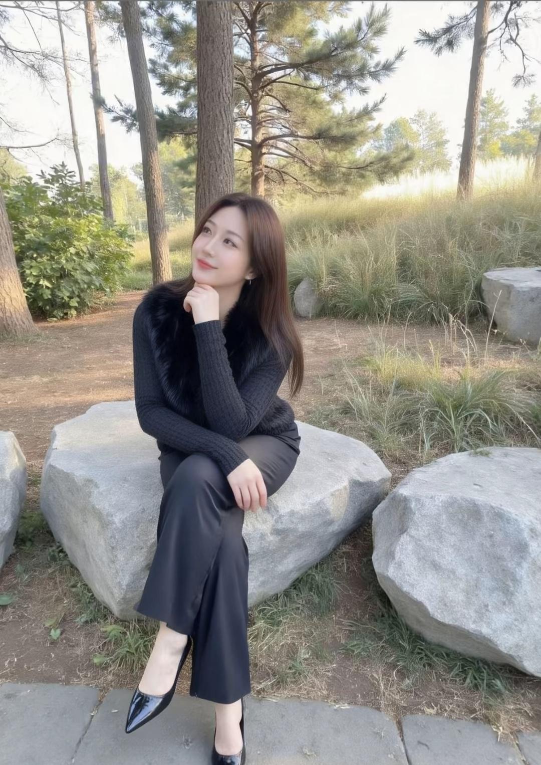秋日森林中的优雅沉思,黑衣女子静坐石上,沉思悠然。