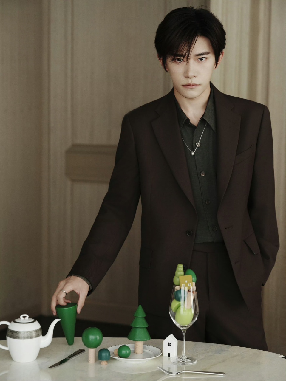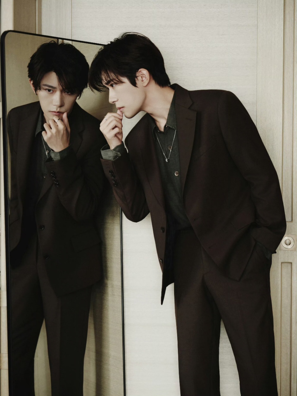 易烊千玺美拉德棕色西装 易烊千玺棕绿色叠穿 墨绿色衬衫好有韵味