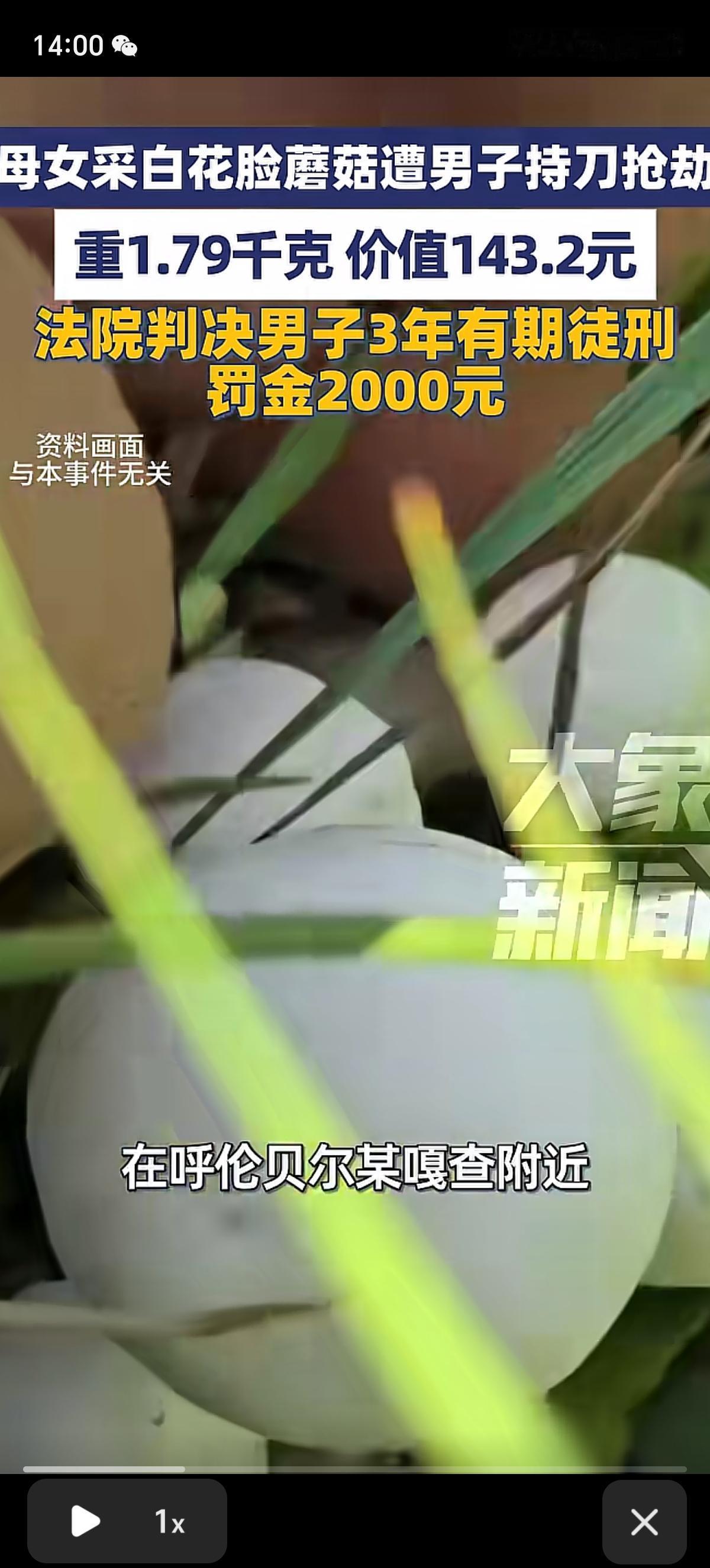 呼伦贝尔一对母女如采蘑菇,一个骑摩托车的男子停下来抢劫母女二人,没有选择劫色,劫财了,抢走了3.58斤蘑菇,价值143.2元。 男子喜获蹲耙犁子3年,罚款2000元。抢的是白花脸蘑菇,通常指白毒伞等有毒蘑菇,外观既像松茸,又像鸡枞菌。 松茸的价位人工的大概600元一斤,野生新鲜的贵的那种大概900元一斤。鸡枞菌50到80元一斤。 男子把白花脸蘑菇看成是松茸的可能高,还是他真的饿了可能更高?