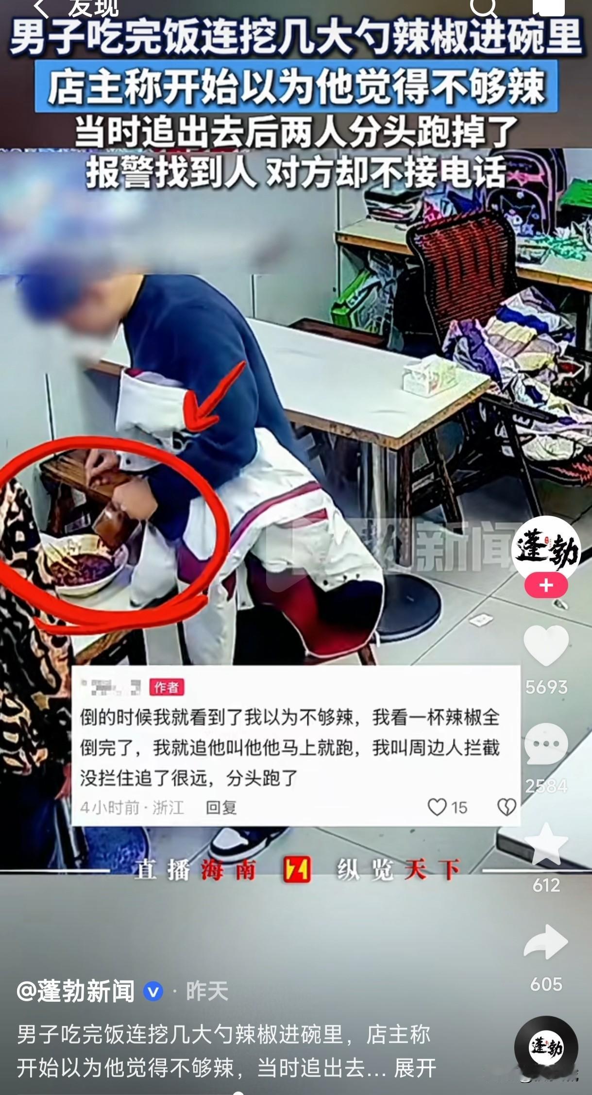 男子吃完饭连挖几大勺辣椒倒进碗里,店主以为他要连汤一起喝掉,谁承想他用筷子搅了一下撒腿就跑,店主追出去却没追上,报警后找到人他又不接电话。 有些人说是店主格局小了,而有些人又说是这顾客缺德,没有教养更没有素质,这是坏到骨子里已经化脓了,那些说店主格局小的人,肯定也和这顾客一样属于那种没素质缺德带冒烟的家伙,吃一碗饭以为自己就很了不起了,以为自己花钱了就可以为所欲为了是吗?那一碗饭能挣多少钱?自己为什么不换位思考一下,都挣的是辛苦钱,如果真正有钱还会去这种小店吗?如果这顾客去五星级酒店吃饭是不是该要服务员喂他吃了? 有些人的坏是天生骨子里自带的,这种人应该给曝光出来让网友都看看他丑陋的嘴脸,也要父母看看自己生了个什么玩意?