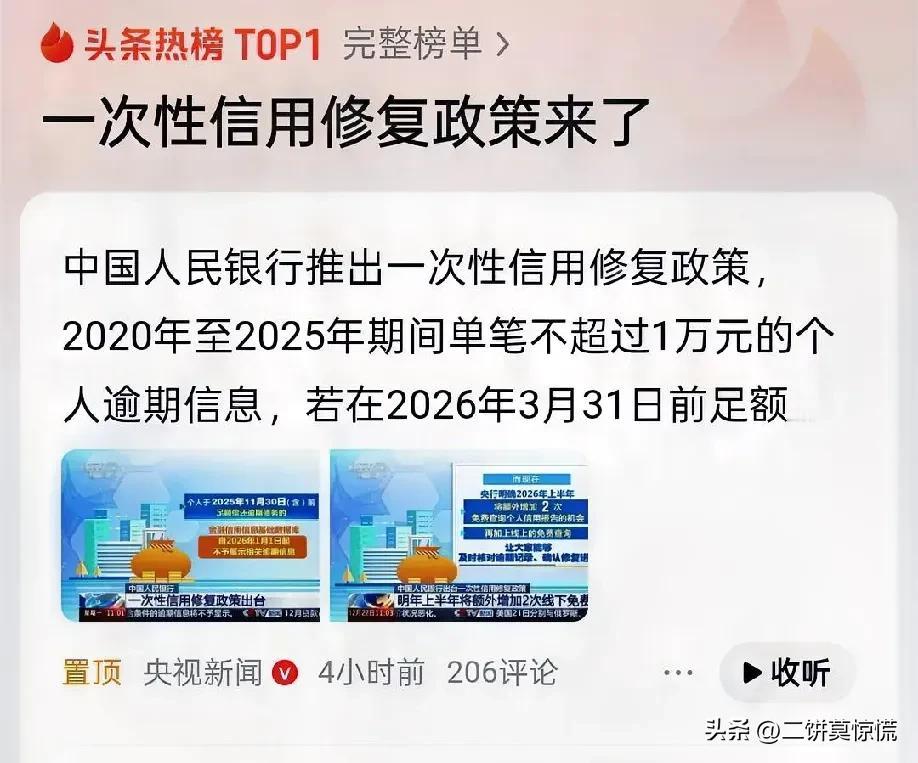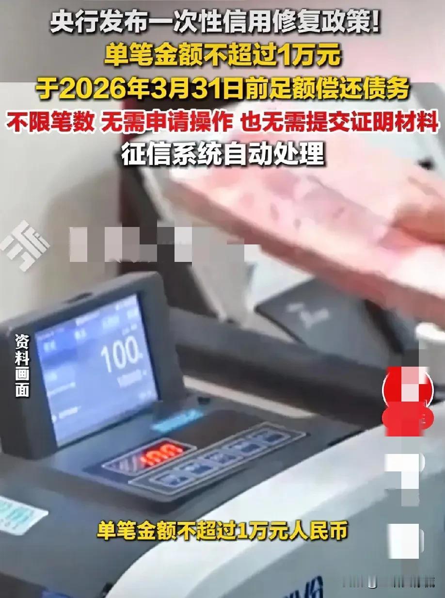 我表弟高兴的说:央妈这个新政策真是及时雨啊。我做小生意这几年,有时候资金周转不开,信用卡和贷款有过几笔小逾期,虽然每笔都不超过一万块,但一直担心影响征信。现在好了,政策说了,明年3月底前还清,这些记录就能一键清零啦。 看着表弟兴奋的样子,我也替他高兴。 这个政策,等于给了我们一次修复信用的宝贵机会,而且不用自己跑腿申请,系统会自动处理,真的太方便,也太暖心了。 表弟觉得肩上的担子轻了不少,终于能过个安心年了。 希望这个好政策,能真正的帮到那些一直在努力,有时候又心有余力不足的人。 大家加油,早日上岸![心]
