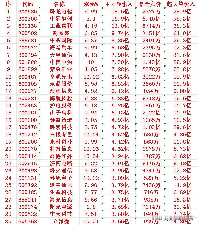 12月22日尾盘30分钟,主力资金“大幅抢筹的”30名单一览! 卧龙电驱:资金净流入 18.5 亿元,集合竞价成交 2327 万元 中际旭创:资金净流入 15.9 亿元,集合竞价成交 5.40 亿元 工业富联:资金净流入 13.0 亿元,集合竞价成交 6714 万元 新易盛:资金净流入 9.74 亿元,集合竞价成交 3.51 亿元 中芯国际:资金净流入 8.25 亿元,集合竞价成交 2491 万元 海马汽车:资金净流入 8.08 亿元,集合竞价成交 2396 万元