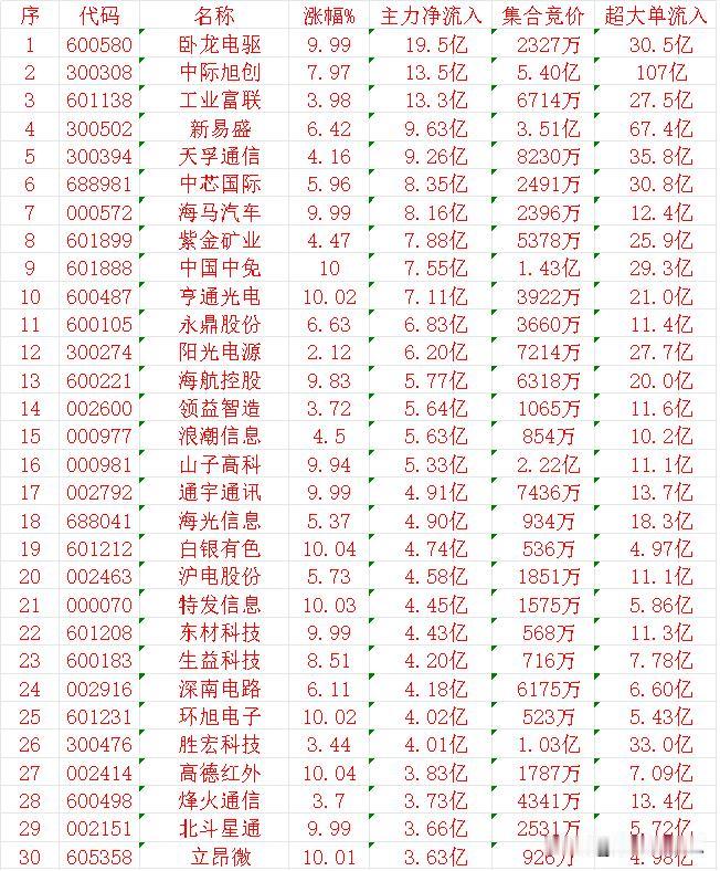 12月22日收盘,主力资金,已经大幅卖出的30名单: 航天电子:资金净流出 14.0 亿元 永辉超市:资金净流出 11.8 亿元 雪人集团:资金净流出 11.1 亿元 平潭发展:资金净流出 9.66 亿元 赛微电子:资金净流出 8.50 亿元 12月22日收盘,主力资金“大幅买入”的30名单: 卧龙电驱:资金净流入 19.5 亿元 中际旭创:资金净流入 13.5 亿元 工业富联:资金净流入 13.3 亿元 新易盛:资金净流入 9.63 亿元 天孚通信:资金净流入 9.26 亿元 中芯国际:资金净流入 8.35 亿元 海马汽车:资金净流入 8.16 亿元 紫金矿业:资金净流入 7.88 亿元 中国中免:资金净流入 7.55 亿元 亨通光电:资金净流入 7.11 亿元 永鼎股份:资金净流入 6.83 亿元 阳光电源:资金净流入 6.20 亿元 海航控股:资金净流入 5.77 亿元 领益智造:资金净流入 5.64 亿元 浪潮信息:资金净流入 5.63 亿元 山子高科:资金净流入 5.33 亿元 通宇通讯:资金净流入 4.91 亿元 海光信息:资金净流入 4.90 亿元 白银有色:资金净流入 4.74 亿元 沪电股份:资金净流入 4.58 亿元