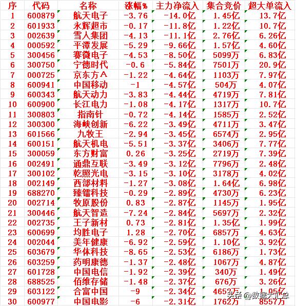 12月22日收盘,主力资金,已经大幅卖出的30名单: 航天电子:资金净流出1
