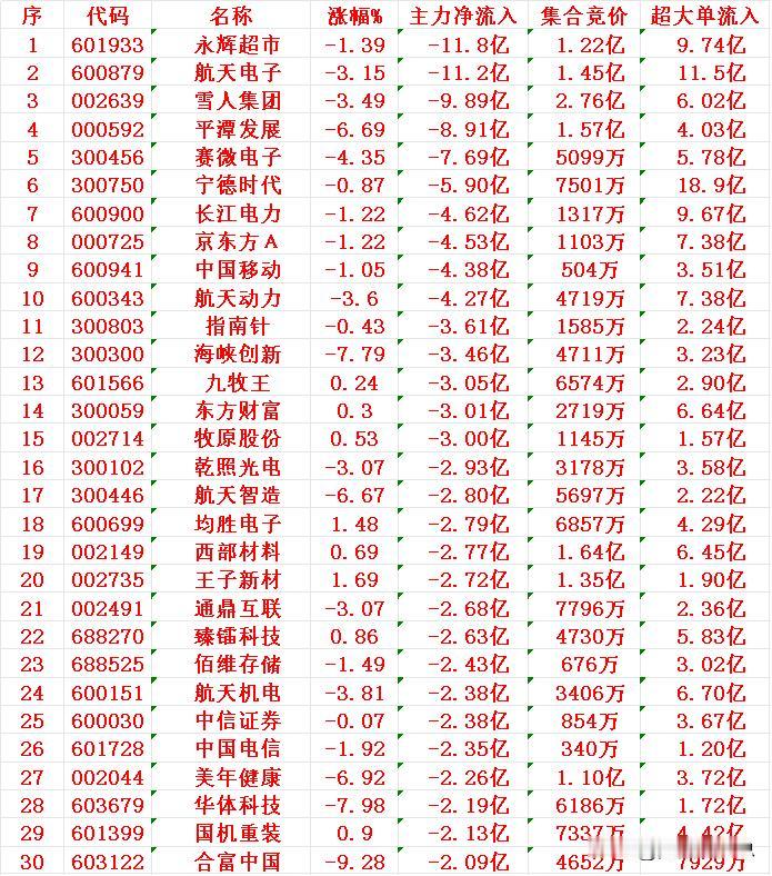 12月22日尾盘30分钟,主力资金大幅卖出的名单! 以下是主力资金净流出前五的个股明细(按净流出金额从高到低排序) 601933 永辉超市:资金净流出 11.8 亿元,超大单流入 9.74 亿元 600879 航天电子:资金净流出 11.2 亿元,超大单流入 11.5 亿元 002639 雪人集团:资金净流出 9.89 亿元,超大单流入 6.02 亿元 000592 平潭发展:资金净流出 8.91 亿元,超大单流入 4.03 亿元 300456 赛微电子:资金净流出 7.69 亿元,超大单流入 5.78 亿元