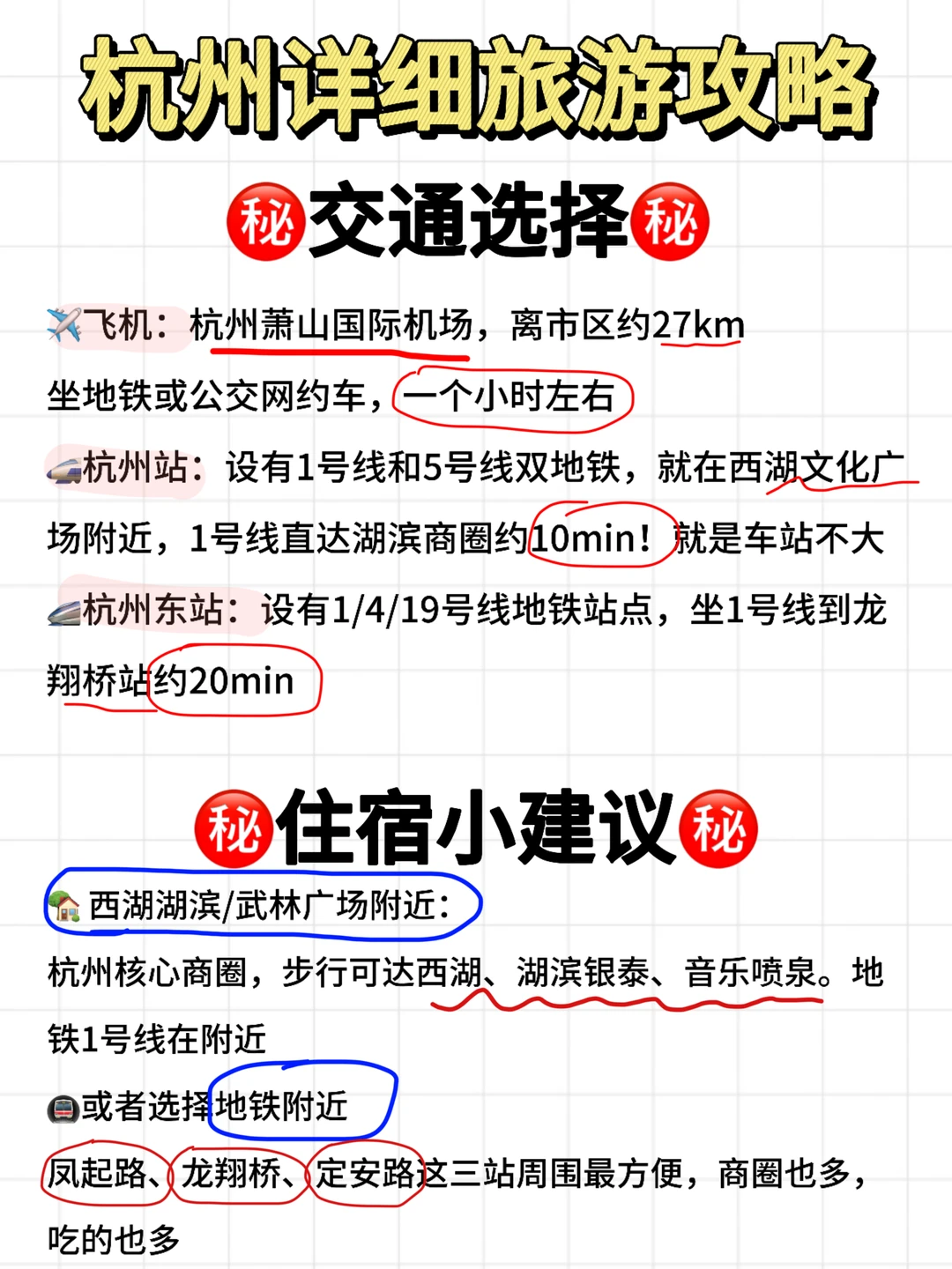高铁优先选杭州站和杭州东站🚄,地铁直达市区各景点,到西湖景区仅20min;飞机✈️到杭州萧山国际机场,乘地铁1号线/7号线可直达市区,约40min