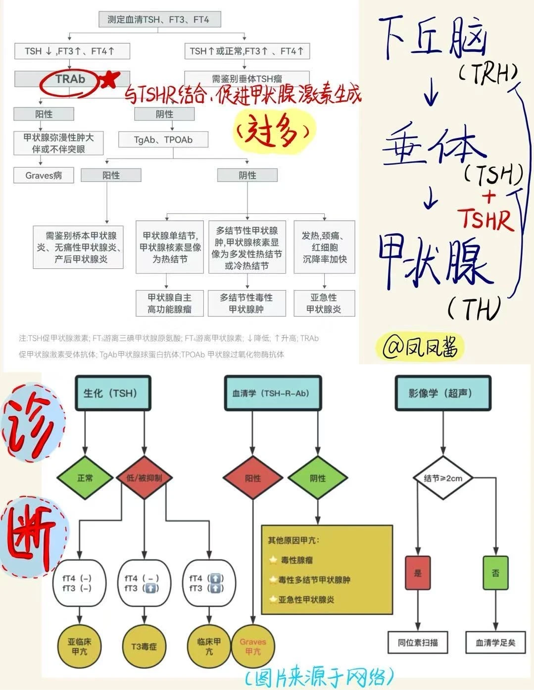 [向右R]Graves病是甲亢蕞常见的原因,是一种自身免疫病。患有Graves病的朋友们体内通常会产生TRAb抗体,与TSHR结合,促进甲状腺不受控制的产生过多的甲状腺激素TH,出现心悸,多汗等甲亢表现。