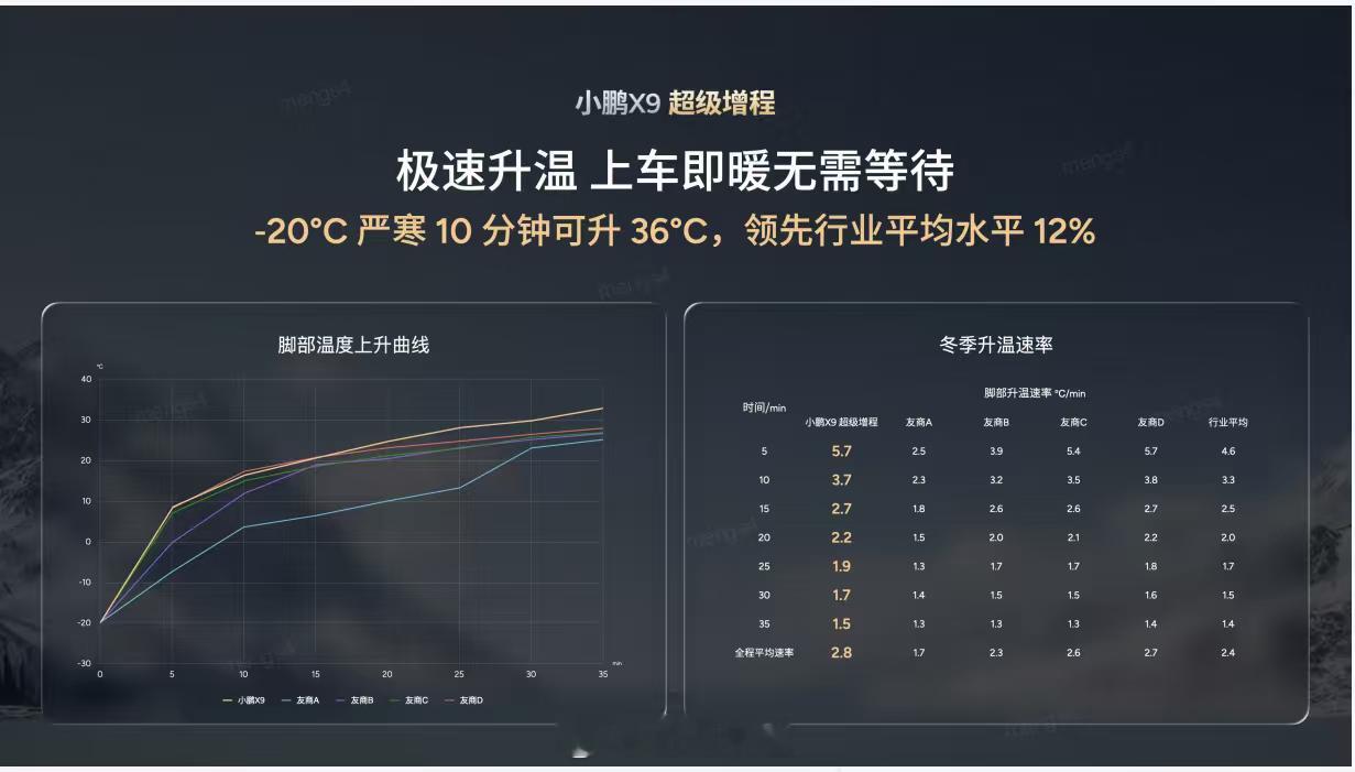 虽然现在很多车都能远程开空调,但如果哪次忘记,上车像进冰窖一样就真的太带劲了小鹏X9超级增程冰雪体验日 没想到小鹏X9超级增程还有更牛的。就黑河这个气温,从-15°C到21°C,升温36℃只要10分钟!结合五温区空调和全车座椅加热,全家人都舒舒服服的~小鹏X9极寒10分钟升温36度冰窖变温室,凭借全球首创11热源AI热管理系统,制热更强,能耗更低。怪不得北方用户这么喜欢X9超级增程