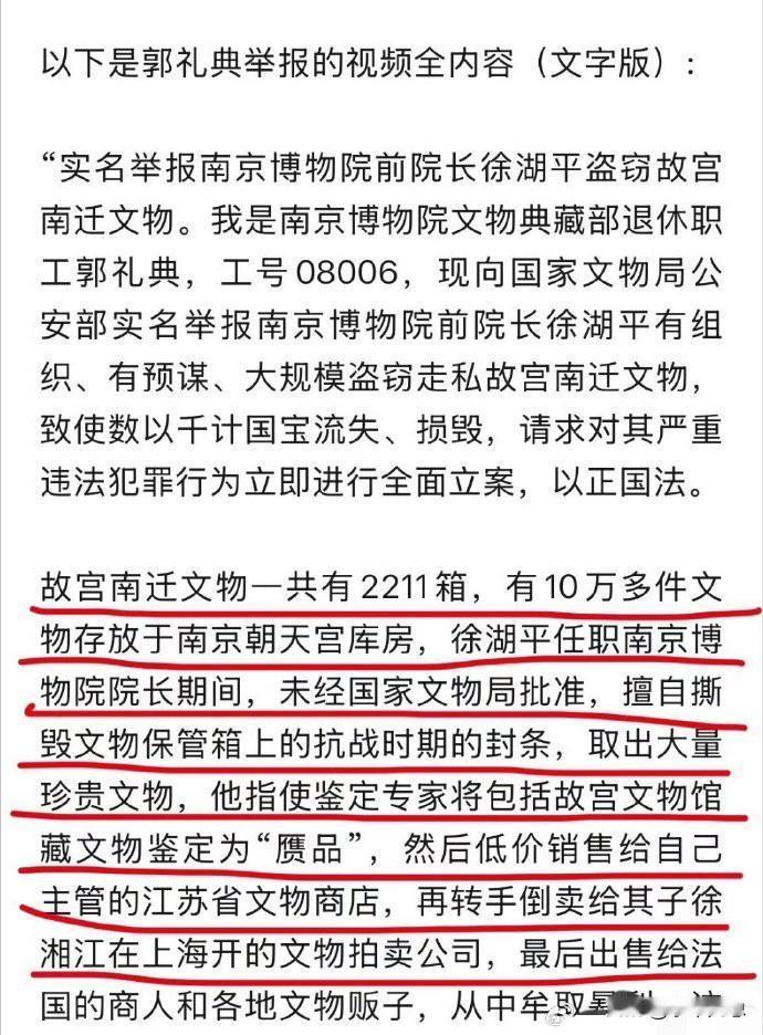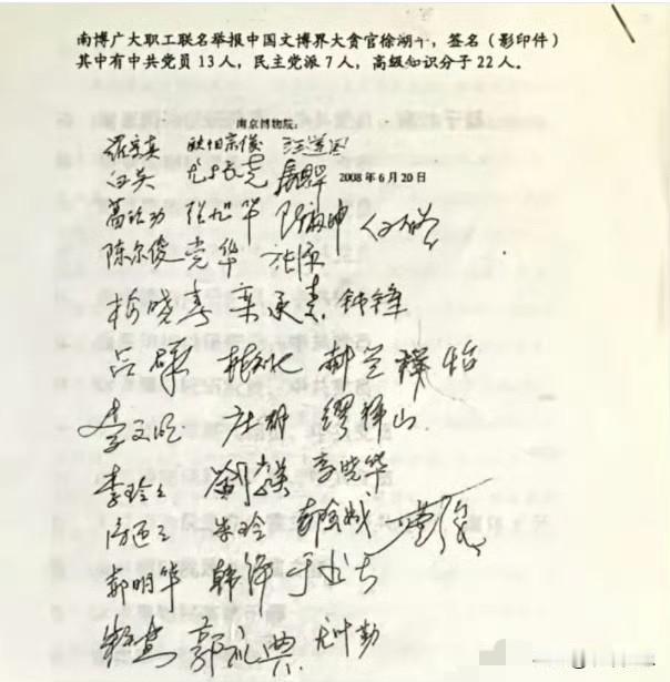 2008年,南京博物院42名资深干部职工,联名举报院长徐湖平大规模盗窃、走私故宫南迁国宝文物,贪污腐败! 这些普通岗位上的正义者们,来自不同党派:其中共产党员13人,民主党派7人,高级知识分子22人。他们亮明身份,顶住被报复的压力,集体实名举报。 举报人称:当年新华社内部参考资料上已经刊登“徐湖平腐败材料”,但因为他行贿对象太多,背后势力过于庞大,最后石沉大海,不了了之…… 幸好现在徐湖平还没死,虽然没几年活头了,但决不能让他带着庞大的宝藏和优秀的声誉地位,离开这个世界,决不能让他的子孙后代坐享腐败成果。 现在,除了要调查清楚庞莱臣的画是真是假,重点还要搞清楚:当年南博库房里的10万件故宫南迁文物,到底还剩多少! 40多个良心博物人,居然告不倒一个贪腐分子,只能说明背后的保护伞太大了。致敬这些正义的老先生们,他们数十年如一日的与恶势力斗争,感谢网络时代,让灯下黑再也玩不下了。 人民的眼睛是雪亮的!如果解决问题的人,变成了掩盖问题的人,那后果将不堪设想。