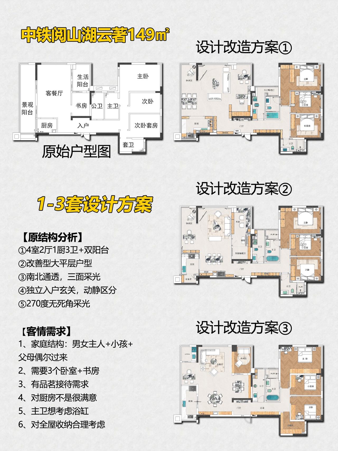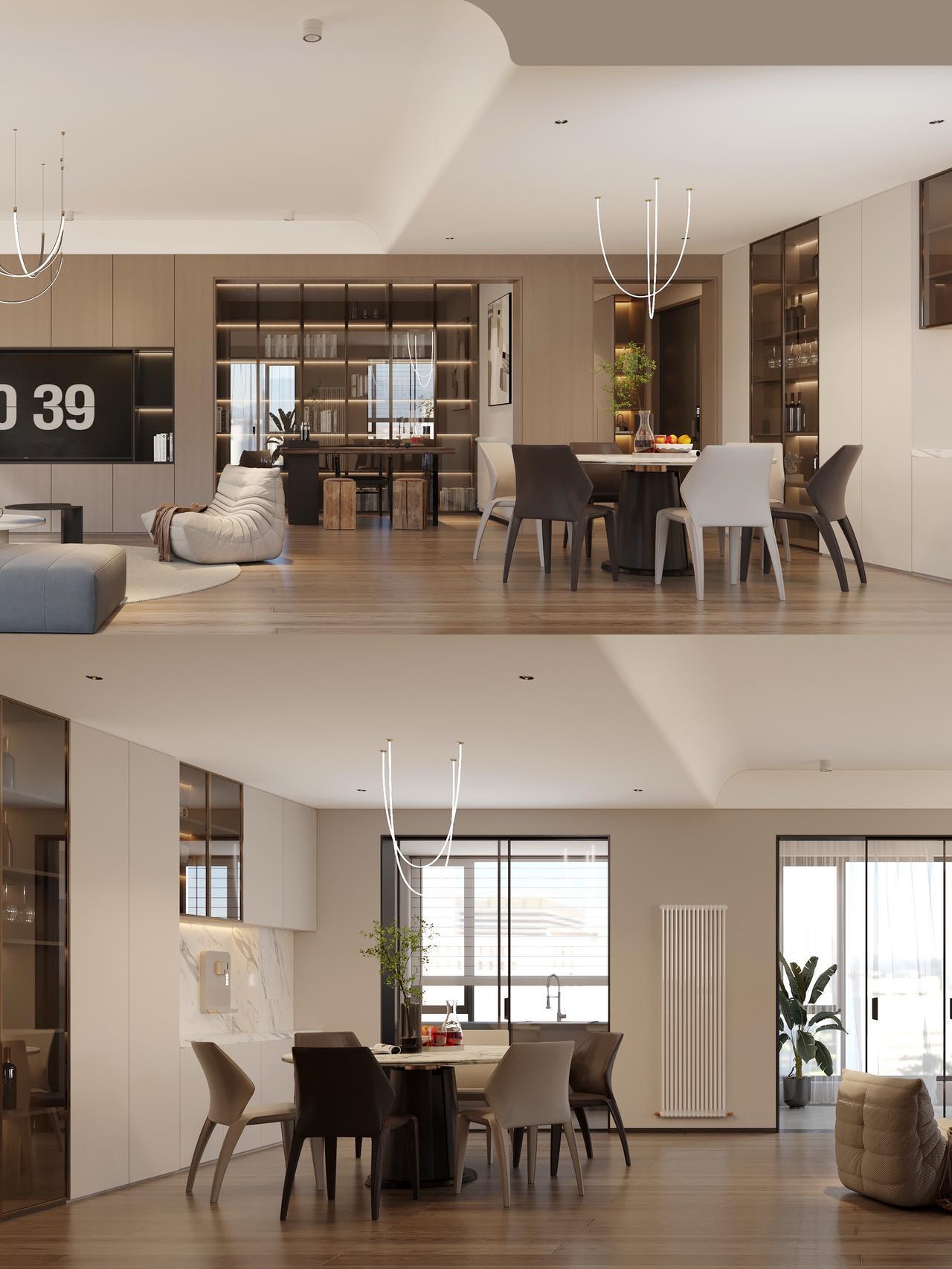 贵阳装修|中铁阅山湖云著160㎡大平层!哈喽👋 我的朋友们🧑🤝🧑 今天给大家带来一套大平层装修设计案例『中铁阅山湖云著160㎡现代风格』❗️ 项目信息📋 📍楼盘:中铁阅山湖云著 🏠户型:大平层 📏面积:160㎡ 🎨风格:现代风格 🏠【原始户型分析】 ①4室2厅1厨3卫+双阳台 ②改善型大平层户型 ③南北通透,三面采光 ④独立入户玄关,动静区分 ⑤270度无死角采光 📝【客情需求】 1、家庭结构:男女主人+小孩+父母偶尔过来 2、需要3个卧室+书房 3、有品茗接待需求 4、对厨房不是很满意 5、主卫想考虑浴缸 6、对全屋收纳合理考虑 🎨【设计解说】 ✅空间动线是核心亮点,也是这个户型的优势所在,动静区分合理,入户门厅以端景柜和鞋柜组合,与两端玻璃柜体形成虚实对比,线性灯光嵌入柜体,延伸视觉纵深感的同时,让收纳与展示功能完美融合。 ✅客餐厅采用开放式布局,浅木色地板通铺全域,搭配深灰软质沙发与异形休闲椅,冷暖材质碰撞出高级质感;嵌入式电视柜结合玻璃展示书柜,将极简美学与实用主义结合得恰到好处。 ✅餐厨区以玻璃隔断界定空间,原生木质感的餐桌与金属线条灯具呼应,既保留互动性又划分功能区。卧室延续整体的低饱和度色调,灰色艺术漆墙面搭配线性壁灯,营造出静谧的休憩氛围;卫浴空间则以石材与玻璃打造通透感,智能镜柜与悬浮台盆的设计,让细节处尽显精致。 💡整屋以木色为基底,辅以金属、玻璃等材质点缀,在现代简约的框架里,把大平层的居住尺度与轻奢质感诠释得淋漓尽致。 👉【关于我】 一位充满热情、细心、靠谱的90后设计师。拥有别墅、洋房、跃层、大平层、普通住宅10年设计经验。为装修设计发愁的你排忧解难! ✅擅长风格 意式、新中式、现代简约、奶油风、宋式美学、中古风、法式风、现代轻奢等… 📄【个人案例】 中铁阅花溪|中铁逸都|中铁阅山湖|阅山湖云著|华润悦府|中海映山湖|茅台广场|美的林城|金融城|融创九樾府|中海印龙泉|华润九悦|龙湖天曜|龙湖湖山原著|万科鸣翠|万科麓山|铁建城|龙湖舜山府|远大美域|观山小区|建发和玺|保利公园 。。。。。。 中铁阅山湖云著 中铁阅山湖臻藏 中铁阅山湖越麓 阅山湖云著