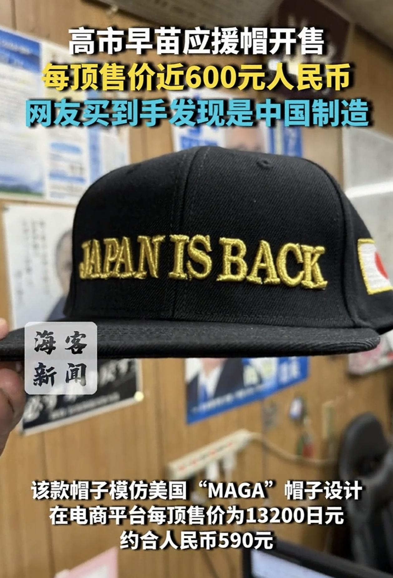 高市早苗应援帽竟是中国制造,这事日本人挺破防,作为一个中国人,我心里也挺不是滋味。 帽子正中央用英文绣着几个大字“日本回来了”。 “日本回来了”,什么意思? 作为一个国家,日本实际上一直都在,并且以4.1万亿美元的GDP总量和3.39万美元的人均GDP长期位于世界前列,从经济上讲,妥妥的世界发达国家。 不仅一直在,甚至还活的很好,有什么回不回来的? 若说退出历史舞台的,我想到的是那个野心膨胀、四处为祸、泯灭人性、残暴杀虐、罪行累累的,给全世界人民带来灾难的,军国主义的日本。 现在她是想让这个日本再次回来吗? 不管是不是,我心里也不希望这顶帽子是中国人做给她的。 钱是好东西,做生意当然想赚钱,这可以理解,但君子爱财取之有道。 这种钱,不赚也罢。 烫手。