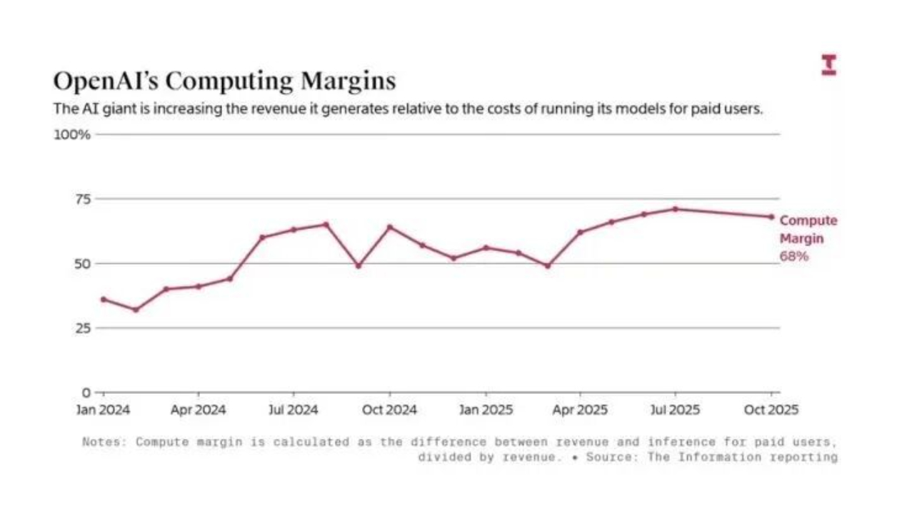 OpenAI 被曝付费业务的算力利润率已经做到 70%,数字听着是很猛,但先别误会成 AI 已经开始暴利了。这个数据只能说明一件事:OpenAI 现在用同样的 GPU,能比以前多赚不少钱,但公司整体依然没赚钱。最烧钱的模型训练、数据中心、电费和长期算力合同,账还远没算平。对比来看,Anthropic 在服务器利用效率上并不差,只是商业化节奏明显慢一拍。OpenAI 的优势在于,更早把 AI 当成一门生意在运营,而不只是搞模型。