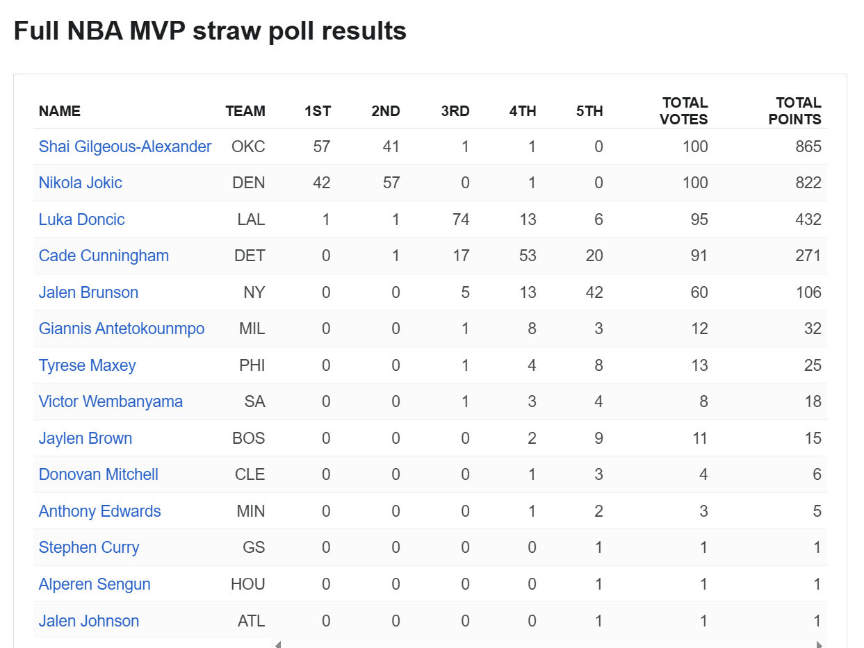 常规赛开赛近两个月,ESPN进行了一次关于MVP的非正式投票,由100名媒体人员参与,结果显示,亚历山大总分865分领先其他球员。湖人球员东契奇得到了1张第一选票,1张第二选票,74张第三选票,13张第四选票和6张第五选票,总得分432分排名第三。
