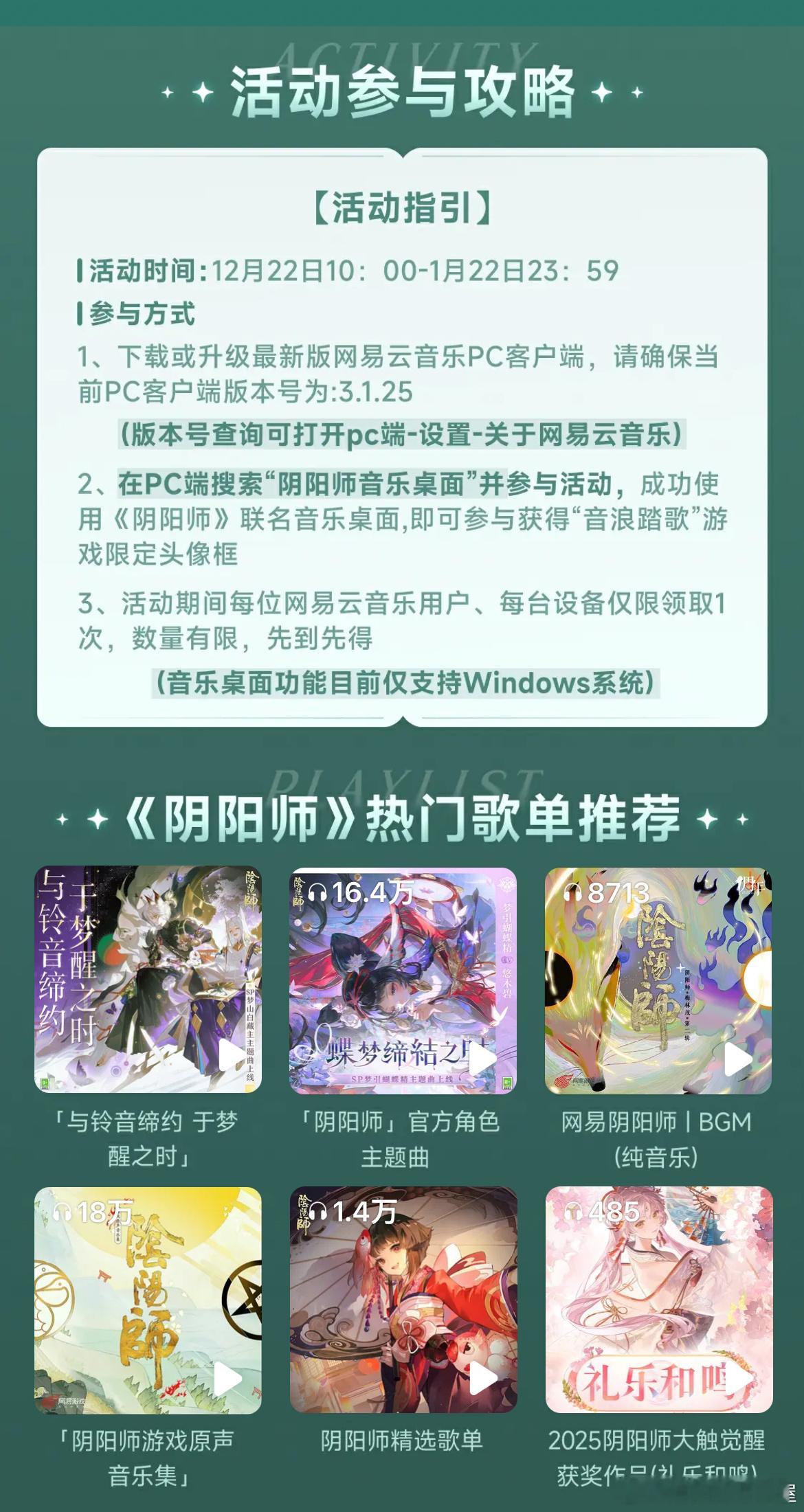 阴阳师手游 网易云音乐联动头像框「音浪踏歌」获取指引step.1 将网易云音乐pc客户端升级至最新版step.2 搜索“阴阳师音乐桌面”并使用【联动头像框为静态】【仅支持Windows系统】