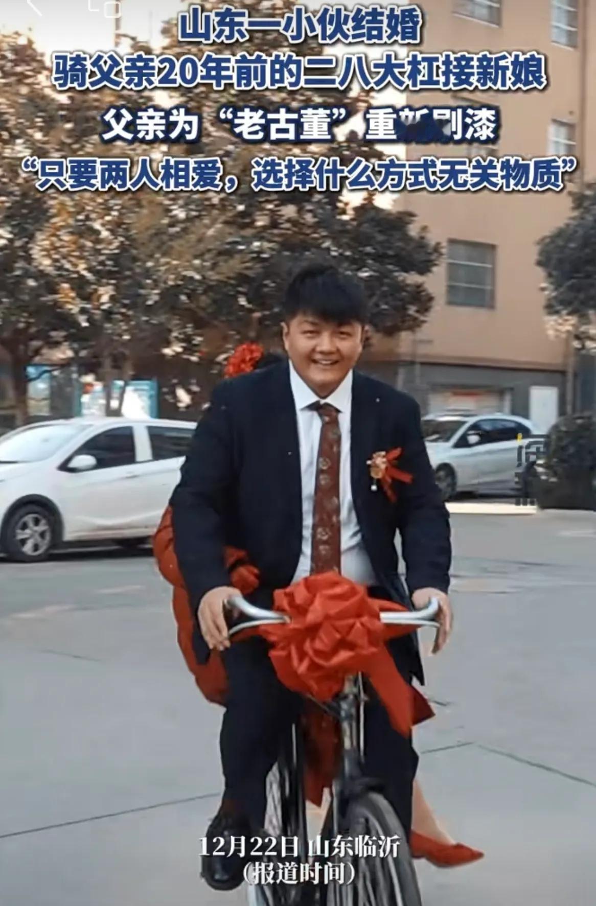 山东临沂,郭女士晒出自己结婚的情形,新郎用一辆二八大杠,把她接回家,形式简单却与众不同。网友纷纷点赞:是真爱无疑了! 从画面看,新郎长得一脸福相,憨厚朴实,新娘浓眉大眼、端庄大方,自行车上披红挂彩,新娘一身红装,两个人都喜笑颜开,格外喜庆。 据郭女士介绍,这辆自行车是新郎父亲的,已经有20多年的历史了,为了接亲,老人还专门把车子刷了一遍漆,看起来跟新的一样。 郭女士认为,用自行车接亲无所谓,两个人感情好,比什么都强。网友纷纷为二人点赞,尤其是新娘郭女士,这么不物质的女孩,真是太难得了! 随着经济的发展,结婚的开销也是水涨船高,接亲都是用好车,而且还要来一串,真是排场拉满。 有的年轻人,为了满足自己的虚荣心,掏空了父母一生的积蓄,郭女士小两口这样懂事的,真的少找。 网友给新郎留言,要好好珍惜郭女士,现在这样的女孩子不多了!同时,也祝福二人幸福。 其实,这不就是40年前结婚的样子吗?老一辈人,没有丰厚的物质条件,但是婚姻却牢固得多,40年前,离结比大约是6个百分点,而2024年离结比达到57.5个百分点,是40年前的将近10倍。