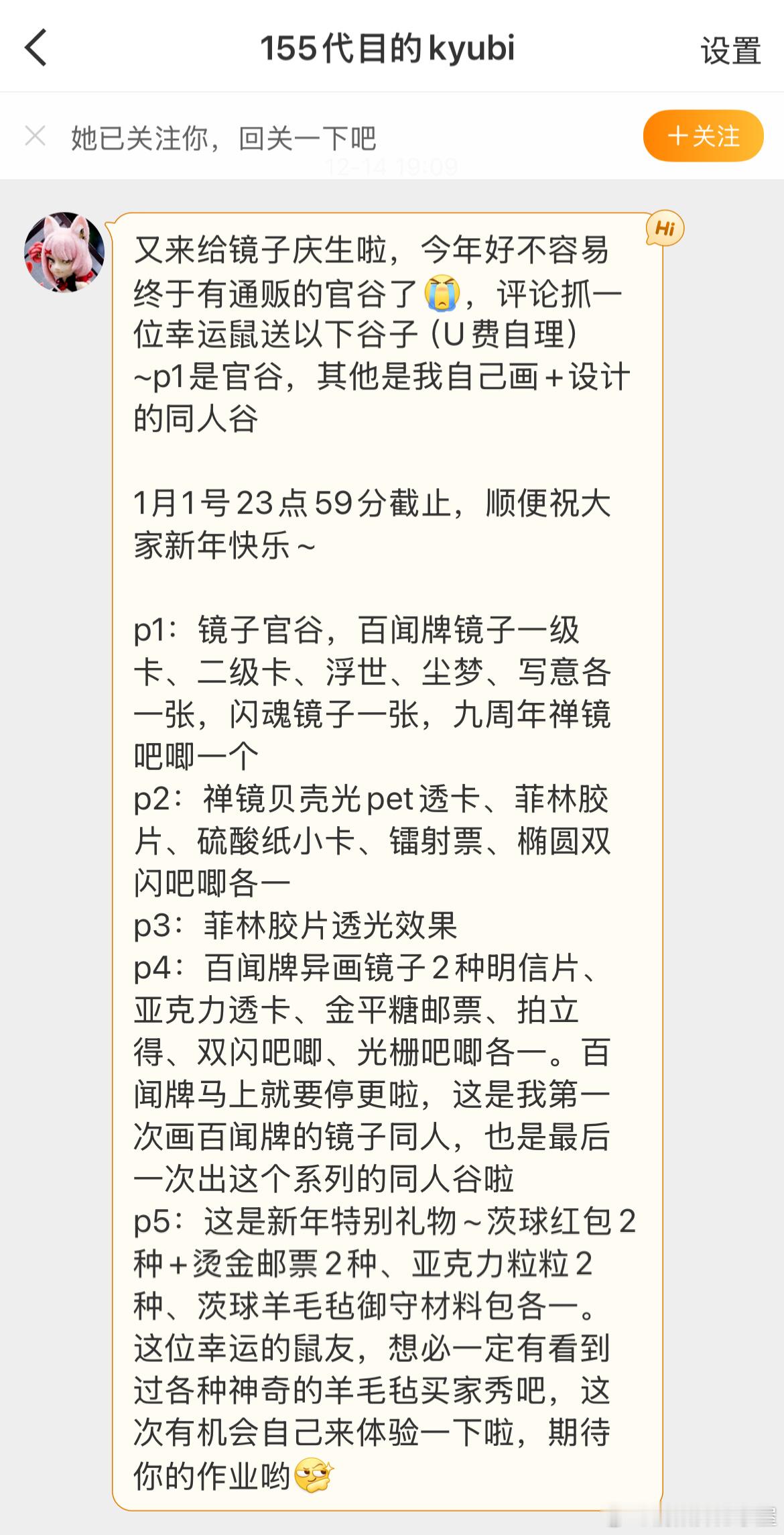 阴阳师手游 评论抓1️⃣位鼠🎁【云外镜官谷➕同人谷大大大大大礼包】🤍代发代揪/劳烦大家阅读图一(私信内容)和图二-五(奖品展示)🖤一起祝云外镜12月21日生日快乐!可惜没卡到12月21日的12点21分发布留言即有机会抱走来自大佬提供的大礼包 *运费需自理* 带着祝福的心意,来试试看吧!👇🏻💓1月1日23点59分截止,祝大家圣诞&新年快乐! 抽奖详情