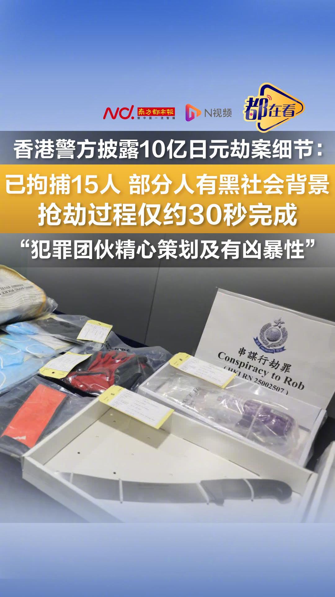 #香港10亿日元劫案主谋已落网#【香港10亿日元劫案新进展披露!最初被拘捕的内地男子获保释】#香港警方通报10亿日元劫案详情##10亿日元劫匪有黑社会背景#香港10亿日元大劫案持续引发公众关注。12月22日,香港警务处公共关系科工作人员告诉南都N视频记者,警方已拘捕包括案件主谋在内的15名涉案本地人员,部分人员有黑社会背景,他们涉嫌“串谋抢劫”。而此前被拘捕的43岁内地男子已获准保释,但因该男子携带部分毒品及外币,其与案件的关系仍有待警方进一步调查。12月22日,香港港岛总区刑事部(行动)警司冼国明在案情简报会上披露,此次案件性质恶劣,经警方调查,涉案人员内部分工明确,有人直接参与案件,有人负责“望风”,还有人负责车辆接应。其中部分人员有黑社会背景,多数涉案人员报称无业,有的是楼盘散工。警方还检获部分涉案人员作案时穿着的衣物、用过的口罩及涉案刀具等。冼国明指出,涉案人员仅花约30秒就抢去4个装有大量现金的行李箱,且有组织地将赃款转移到其他车辆,涉案人员手法娴熟,警方相信该案件一定经过精心策划。关于受害者与涉案人员的关系,警方仍在调查,目前已有6男1女被起诉,不排除将会有更多人被拘捕。目前警方仍在追寻涉案赃款的下落。上述人士还提醒,携带大量现金在公众场合仍具有极高风险,如市民有必要携带大量现金外出,需增强安保措施,如适当增派人员,做好行车路线的保密措施等。同日,香港警务处公共关系科工作人员告诉南都记者,“经警方调查,此前被拘捕的43岁内地男子已获准保释,但因案发当日,该男子身上携带有部分毒品及外币,因此其与案件的关系仍有待警方进一步调查。”南都此前报道,12月18日9时6分,香港警方接获一名换汇店职员报案称,一名本地男子和一名39岁持港澳通行证的内地男子在中区永乐街附近,被多名持刀男子劫走约10亿日元。劫匪得手后便搭乘私家车往苏杭街方向逃去。经初步调查,警方在港铁上环站D出口外拘捕一名男子。12月19日,关于被拘捕男子的身份,香港警务处方面向南都记者表示,“该名男子为43岁内地人,持港澳通行证,警方正在调查他与其中那名39岁受害者的关系,目前仍在全力追捕涉案在逃人员。”采写:南都N视频记者 陈丹玲