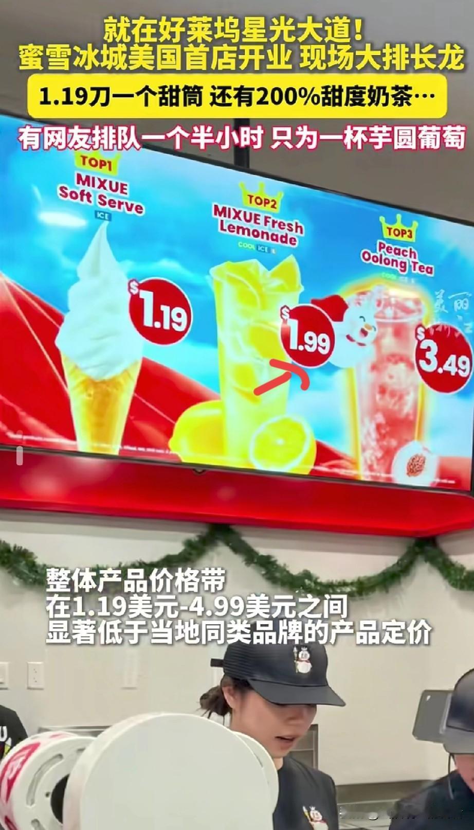 离谱!蜜雪冰城杀到美国,直接把甜度干到200%! 谁能想到!国内卖几块钱的蜜雪冰城,漂洋过海到美国居然玩起了“甜度暴击”! 三分糖、五分糖?在美国门店的菜单上压根找不到!直接上120%、200%的超甜档位,一口下去甜到上头,星巴克的苦咖、可口可乐的汽水,在它面前都得靠边站! 更绝的是,这居然是少见的在国外卖得比国内贵的国货!国内几块钱的柠檬水,到了美国价格翻几倍,可美国人偏偏买账,门店门口天天排起长队,买单的队伍拐了好几个弯! 不得不说,雪王这波“入乡随俗”太会了,精准拿捏老外的嗜甜味蕾,果然甜门永存,不分国界! 你觉得蜜雪冰城这波在美国能火多久?