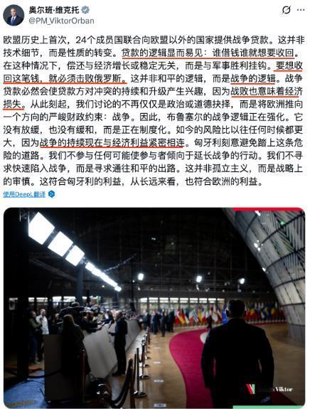 匈牙利总理奥尔班发布的帖子,他用相当简明易懂的方式揭示了欧盟为何给乌克兰提供贷款。 匈牙利总理奥尔班的一则帖子,算是把欧盟给乌克兰提供贷款的真实心思扒得明明白白。很多人之前还以为欧盟是出于所谓的“道义支持”才给乌克兰砸钱,没想到奥尔班用最直白的话戳破了窗户纸。 这根本不是什么善意援助,而是用贷款把24个参与国牢牢绑在乌克兰的战车上。说白了就是,谁借出去的钱谁不想往回要?可想要收回这笔贷款,眼下看只有一条路——打败俄罗斯。 当地时间12月19日,欧盟峰会在布鲁塞尔刚敲定2026到2027年度给乌克兰提供900亿欧元贷款的决议,奥尔班当天就召开新闻发布会泼了冷水,还把这背后的逻辑讲得一清二楚。 他说现在的欧盟就像站在火车站月台上,24个成员国非要买通往战场的火车票,只有匈牙利、斯洛伐克和捷克三国在找和平的出口,最后干脆选择退出不参与这笔联合贷款。这话听着刺耳,但句句都戳中了要害,把欧盟这种“捆绑式援乌”的套路摆到了台面上。 要搞懂这套路,得先弄明白这笔900亿欧元贷款的运作模式。按照欧盟敲定的方案,这笔钱不是成员国直接拿出来的,而是先由欧盟出面在金融市场上借钱,再转手贷给乌克兰。 关键问题就在还款上:这笔钱名义上是让乌克兰还,但明眼人都知道,乌克兰现在深陷战事,经济早就崩了,别说900亿欧元,就算是零头都未必拿得出来。 欧盟自己也清楚这一点,所以方案里藏着个兜底条款——如果乌克兰无力偿还,这笔贷款的本金和利息就得由参与贷款的成员国自己扛。这就等于给24个参与国套上了一个“经济枷锁”。 奥尔班之所以说这是把大家绑在战车上,核心就在这里:只要你参与了贷款,就等于和乌克兰的战事绑在了一起。毕竟没人愿意自己的钱打水漂,既然借了,就必须盼着能收回来。 可怎么才能收回来?乌克兰自己没能力还,欧盟又不可能白白豁免,那就只能寄希望于乌克兰在战场上打赢俄罗斯。只有打败了俄罗斯,要么能让俄罗斯支付战争赔款来填这个窟窿,要么乌克兰才能在战后获得重建和发展的空间,慢慢偿还贷款。 反过来想,如果乌克兰输了,或者战事陷入长期僵局,这笔贷款大概率就成了坏账,24个参与国只能自认倒霉,用纳税人的钱来填补这个缺口。 欧盟一开始也没打算让成员国自己兜底,他们原本打算是用被冻结的俄罗斯资产来覆盖这笔贷款的风险。毕竟现在欧盟境内冻结的俄罗斯主权资产有2100亿欧元,用这笔钱来给乌克兰贷款背书,既不用成员国掏钱,还能名正言顺地制裁俄罗斯,原本是个一石二鸟的主意。 可这个想法最终没能实现,核心原因就是风险太大。首先是法律风险,国际法规定中央银行的资产受主权豁免保护,直接动用甚至没收这些资产,很可能被国际法院裁定为非法,到时候不仅用不了,还得赔偿俄罗斯的损失。 尤其是存放大部分俄资产的比利时,对此坚决反对,担心自己会背上巨额债务。其次是欧元公信力的风险,一旦欧盟开了随意动用他国主权资产的头,其他国家就会质疑欧元资产的安全性,可能会大规模抛售欧元资产,引发资本外流,动摇欧元区的金融稳定。 没办法之下,欧盟才退而求其次,选择用成员国的预算来担保这笔贷款,这也让24个参与国的“战车绑定”变得更加彻底。奥尔班直言,这笔贷款就是“战争贷款”,因为它根本解决不了乌克兰的根本问题,只能让战事继续下去。 现在乌克兰的军事形势越来越不利,900亿欧元根本扭转不了战局,反而会让24个参与国因为要收回贷款,不得不持续向乌克兰提供军事和经济支持,陷入“越陷越深”的困境。 斯洛伐克总理菲佐也直言,这是一个“致命错误”,乌克兰现在需要的是重建资金,而不是让欧盟用贷款把更多国家绑上战车,这种做法只会让冲突持续更久。 欧盟之所以要搞这种“捆绑式援乌”,背后还有个重要原因就是美国的援助在不断减少。今年年初以来,美国总统特朗普逐步缩减了对乌援助,这让乌克兰陷入了“资金悬崖”危机。 根据国际货币基金组织的评估,乌克兰在2026到2027年间需要1350亿美元才能维持基本运转,要是资金跟不上,财政最早可能在明年第二季度就会枯竭。 在这种情况下,欧盟不得不扛起援乌的大旗,但又担心自己单独承担压力太大,所以就想出了用贷款拉更多成员国下水的办法。毕竟参与的国家越多,分摊的风险就越小,也能让援乌的共识在欧盟内部更稳固。 可这种做法已经引发了欧盟内部的分裂。除了匈牙利、斯洛伐克和捷克明确不参与,其他国家内部也出现了“援乌疲劳”的情绪。法、德等国的选民对高昂的公共开支流向境外越来越不满,这让成员国的领导人也面临着不小的政治压力。 奥尔班的帖子其实也是在提醒大家:用贷款捆绑盟友的做法,最终可能会让欧盟陷入更大的困境。毕竟战争没有赢家,就算最后真的能收回贷款,付出的代价也远比这笔钱要大得多。