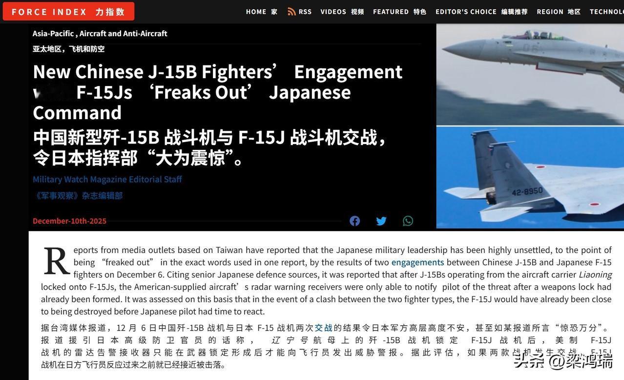 英国的军事观察杂志(Military Watch Magazine)评论歼-15B雷达照射空自F-15J:日本自卫队指挥机关“惊慌失措”(Freaks Out),或者说是破防了,吓傻了,心态崩了。 F-15J雷达已经过时,对歼-15的探测距离只有100公里左右,而歼-15B的雷达对F-15J的探测距离在170公里以上。 歼-15B技术上比F-15J领先约40年。 如果两款战机发生交战,F-15J 战机在日方飞行员反应过来之前就已经接近被击落。