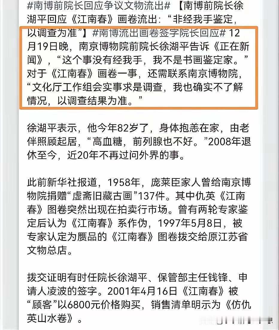 南京博物院原院长徐湖平,面对媒体说自己82岁了,从2008年退休至今,退休后就再过问外界的事,还说《江南春》这个事没有经他的手,他也不是鉴定家。都是白纸黑字,家里都是一个小博物馆,他能否定的了吗?不管是谁,凡是涉及到盗窃倒卖国家重要资产的案件,必须从严从重处罚!#南京博物院#