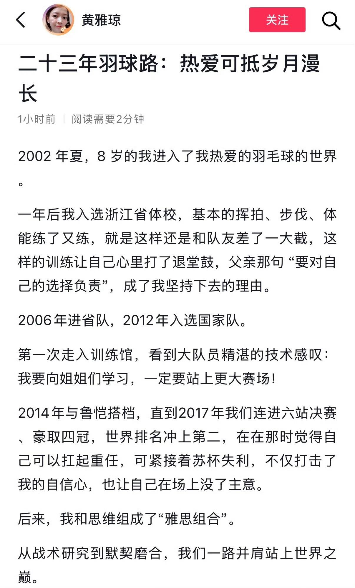 黄雅琼说热爱可抵岁月漫长,她为什么会这样说呢?与此同时,黄雅琼感谢郑思维把遗憾拼成圆满! 每一句话都是内心深处肺腑之言,讲得真好! 二十三年羽毛路,是非常难忘的!有开心,还有不甘心,每一次的坚强,都是勇敢的体现! 通过努力,终于圆梦! 希望,越来越好,最棒的!