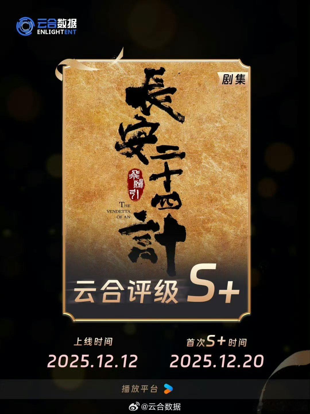 长安二十四计云合 14.4%云合评级S+,优酷站内热度破万、灯塔播放量4696万、猫眼播放量4934万,抖热度1亿+、百指上涨、抖指上涨,各个平台数据稳步上涨,口碑发酵,守护我们最好的谢淮安!