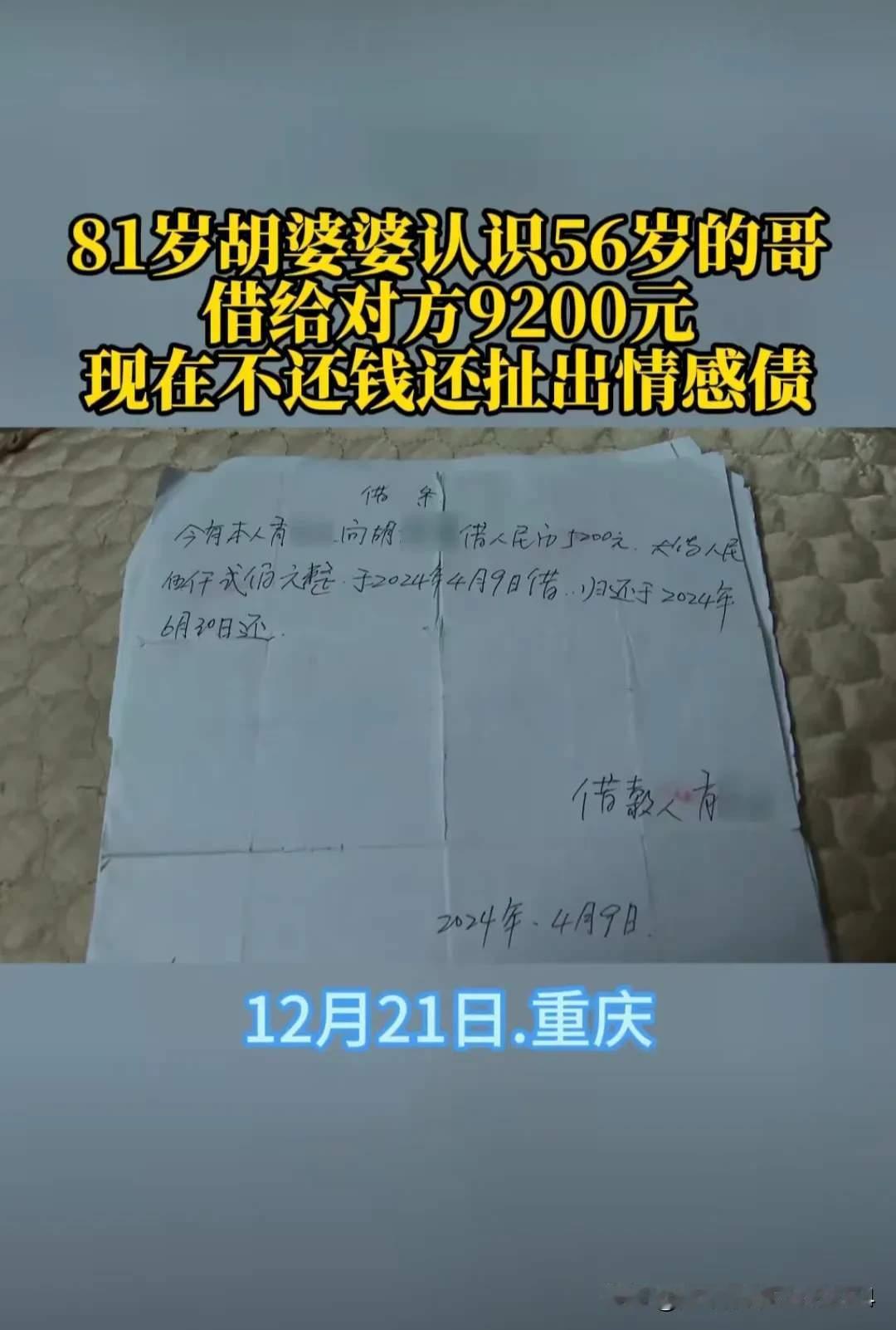 肖先生拿“感情被骗”当挡箭牌,死活不肯还胡婆婆那9200块养老钱,这理由够鸡贼啊! 而这事的来龙去脉,还得从麻将馆的一场偶遇说起。重庆81岁的胡婆婆,平时就爱泡麻将馆消磨时间,在那儿偶遇了56岁的肖先生。两人都是麻将爱好者,聊得贼投机,一来二去就混成了老熟人。 后来肖先生天天跟胡婆婆套近乎,打感情牌软磨硬泡,张口就借走了胡婆婆9200的养老钱。本以为只是朋友间的互帮互助,谁能料到,才过半个月,就扯出了一出狗血的情感罗生门。 这边肖先生倒打一耙直接甩锅,说胡婆婆拿家境当诱饵,主动勾引自己和她谈恋爱;胡婆婆气得拍桌子瞪眼,直呼肖先生就是冲钱来的,还说当时是肖先生先表白,被自己当场拒绝了,毕竟肖先生比自己62岁的儿子还小,要在一块了这辈分实在太乱! 两人各说各的,压根没法私了,无奈之下,胡婆婆把肖先生告上了法院。法院查明借贷事实后,直接判肖先生必须还钱,可他依旧死皮赖脸耍无赖,就是不还,硬是不履行法院的判决,想硬刚权威看看谁的头更铁。 一直到现在,肖先生的账户虽然被法院冻的死死的,但这笔养老钱到底啥时候能真正回到胡婆婆手里,还是个谜呀。而这事儿最让人膈应的是,欠钱还钱本就是天经地义的事,扯感情债当不还钱的底气就是想白嫖的窃贼。 老年人情感骗局 骗婆婆养老钱 麻将案