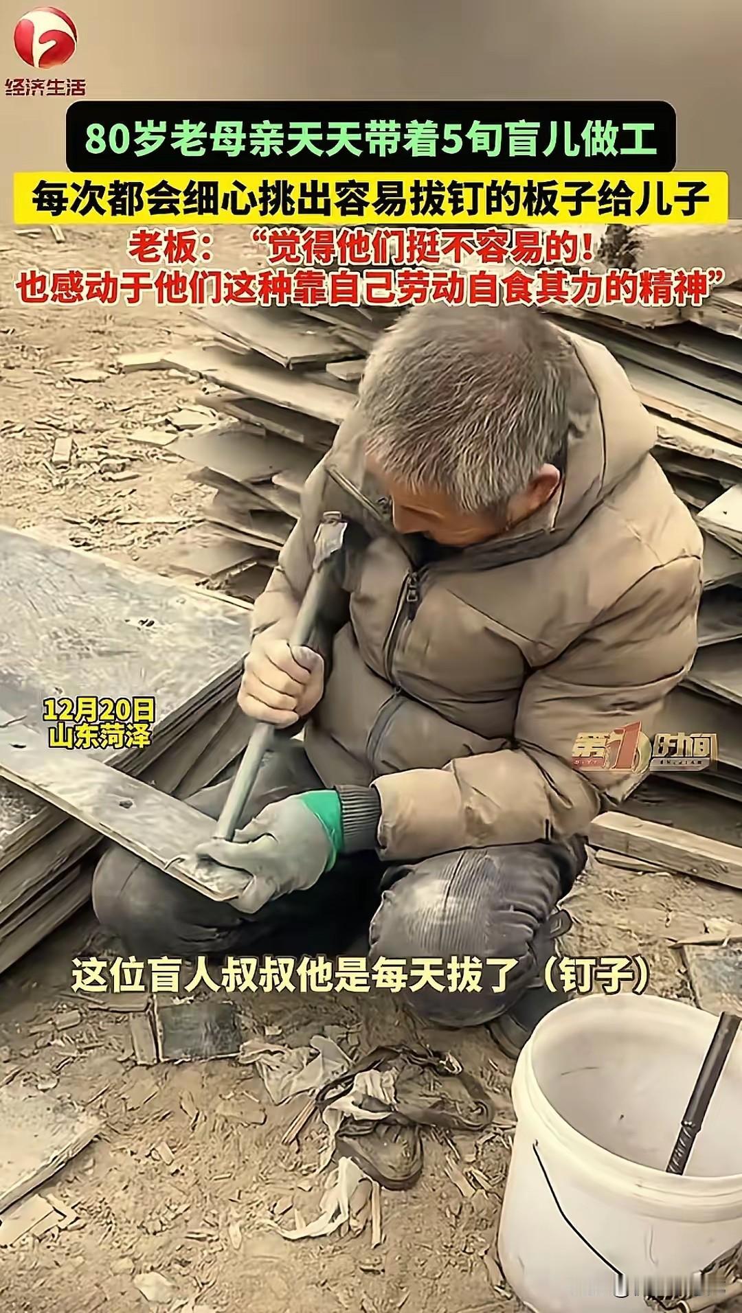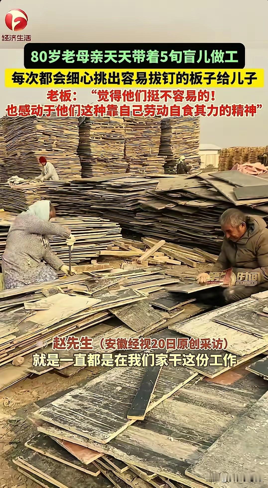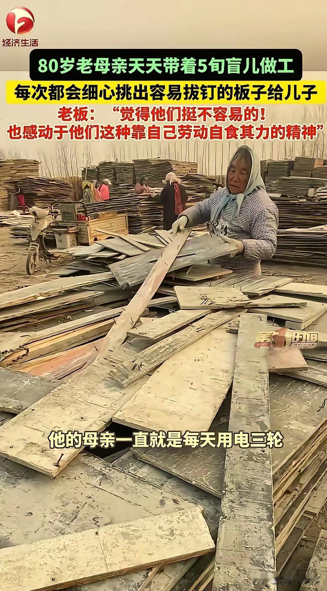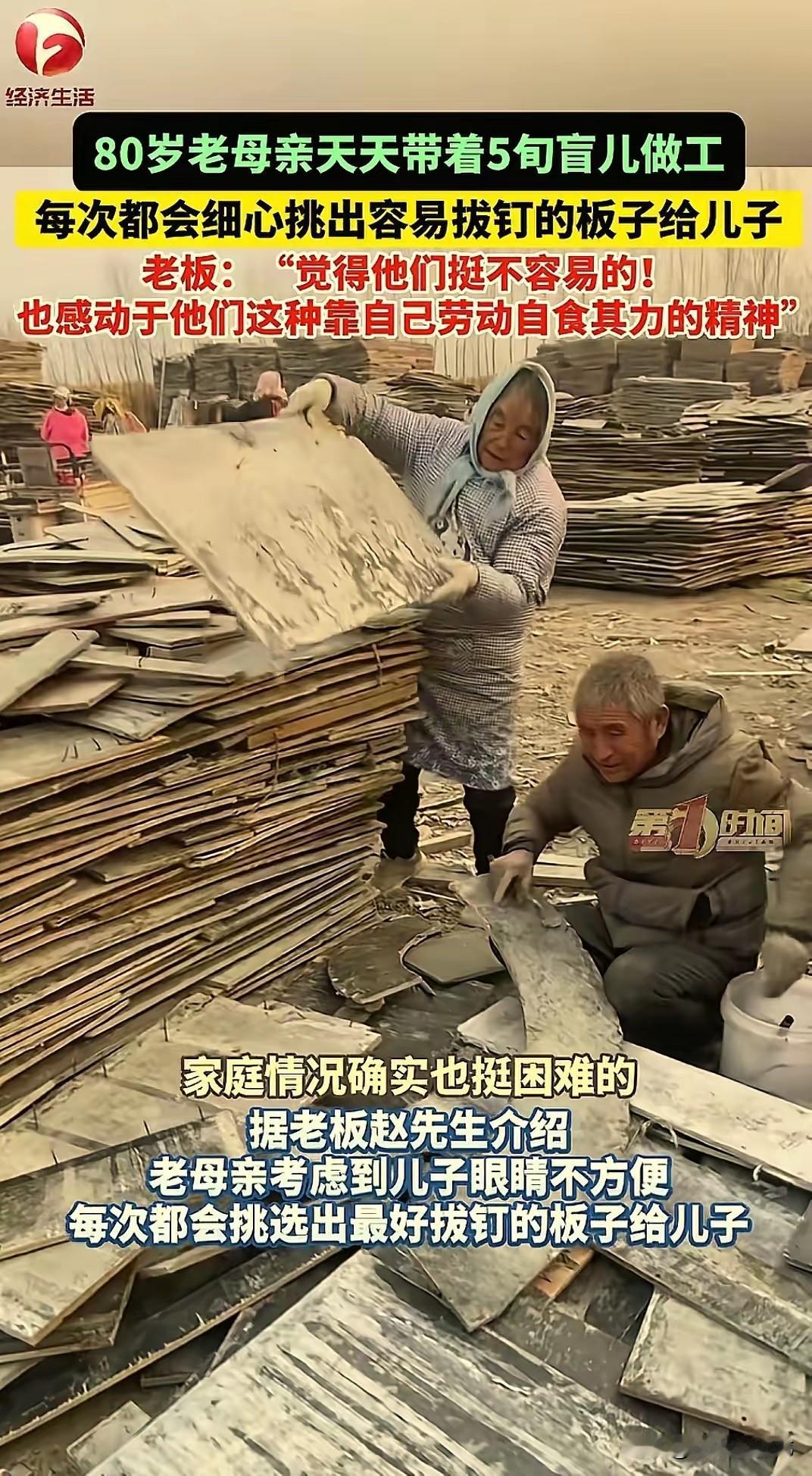 “太感动了!”山东菏泽,一老板拍自家员工的视频火出圈:80岁母亲带着50岁盲人儿子在木板厂拔钉子,母亲专挑好拔的板子递过去,儿子虽然看不见,却摸索着麻利下手,拔出钉子攒着卖钱。 八十岁的老母亲背早就驼成了,手里攥着块皱巴巴的抹布,递木板前总先把钉头擦得锃亮。她怕儿子摸不准位置,怕锈渍硌着儿子的手,很细心。五十岁的儿子眼睛看不见,手上却早练出了本事,指尖往木板上一搭,立马就能辨出钉头在哪儿。羊角锤在他手里跟长了眼睛似的,一撬一拔,动作干脆利落。 母子俩就蹲在木板厂最不起眼的角落里,身边堆着小山似的旧木板,脚下的铁盆里攒着不少拔下来的钉子。老板说,这母子俩不算厂里的正式工人,偶尔过来找点零活干。拔钉子攒着卖的钱没多少,也就够买点米面油,勉强糊口。 他看着心疼,好几次偷偷多塞点钱给老太太,母子俩却死活不收。老太太说只要手还能动弹,就不能白拿别人的东西,儿子是堂堂正正的男子汉,虽然看不见,得靠自己的力气吃饭。 她年纪大了,重活是干不动了,就帮儿子挑挑好拔的板子,擦擦钉头,守在儿子身边,心里才踏实。儿子从不让母亲多操心,很争气。拔钉子的时候屏着气,一颗都不肯漏下,动作更是不敢放慢。 视频传到网上,评论区好多人都看哭了。有人说这就是母爱,八十岁了还在替五十岁的儿子遮风挡雨;也有人佩服这个大哥,眼盲心不盲,靠着一双手挣饭吃,不抱怨不躺平,这母子俩活得太有骨气了。 这年头,不少人动不动就喊生活难,可看看这对母子,才知道什么叫真正的不容易。他们没抱怨过命运不公,也没想着靠别人接济,就凭着一双磨出老茧的手、一颗不服输的心,踏踏实实把日子过下去。这份骨气,比多少豪言壮语都让人敬佩。 感动我们的,就是老母亲递木板时的那份小心,盲人儿子拔钉子时的那份认真,就是母子俩不抱怨、不低头,靠着一双手过日子的那份踏实。比起那些稍不顺心就喊苦喊累的人,他们的日子过得难,却活得格外有精气神。这世上真的还有这么一群人,在拼尽全力、认认真真地活着。