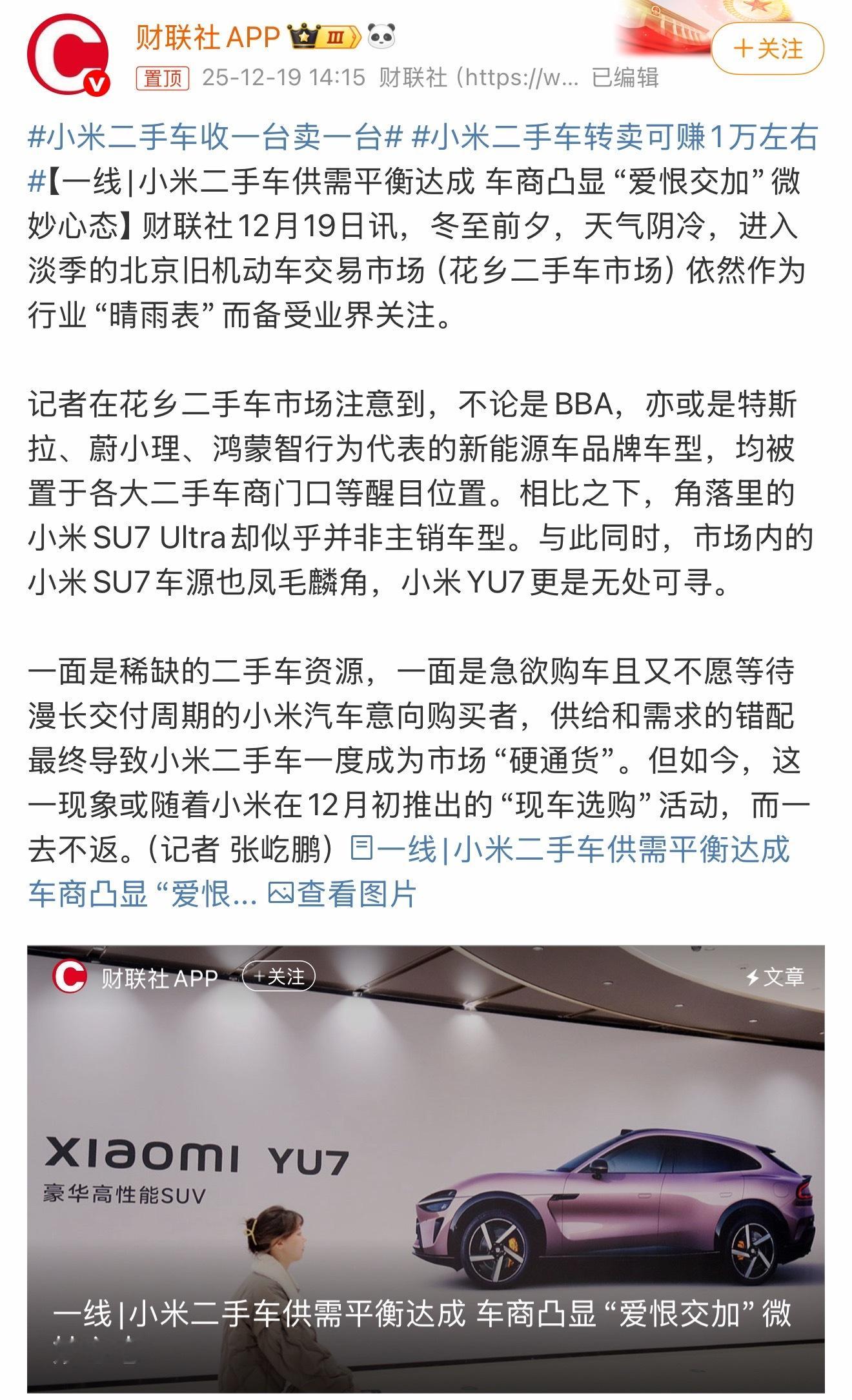 小米二手车收一台卖一台花乡市场的信号很明显:BBA、特斯拉占据门口C位,小米SU7 Ultra车源稀缺、并非主销。此前因交付周期长,二手SU7一度成“硬通货”,车商基本“收一台卖一台”,溢价一万并不稀奇。如今小米上线“现车选购”,供需逐步拉平,溢价被迅速压缩,车商心态爱恨交加:好卖但不再暴利。对消费者是利好,少等、少加价、选择更多。后续看产能爬坡和新品节奏,价格回归理性大概率是主线。小米二手车转卖可赚1万左右