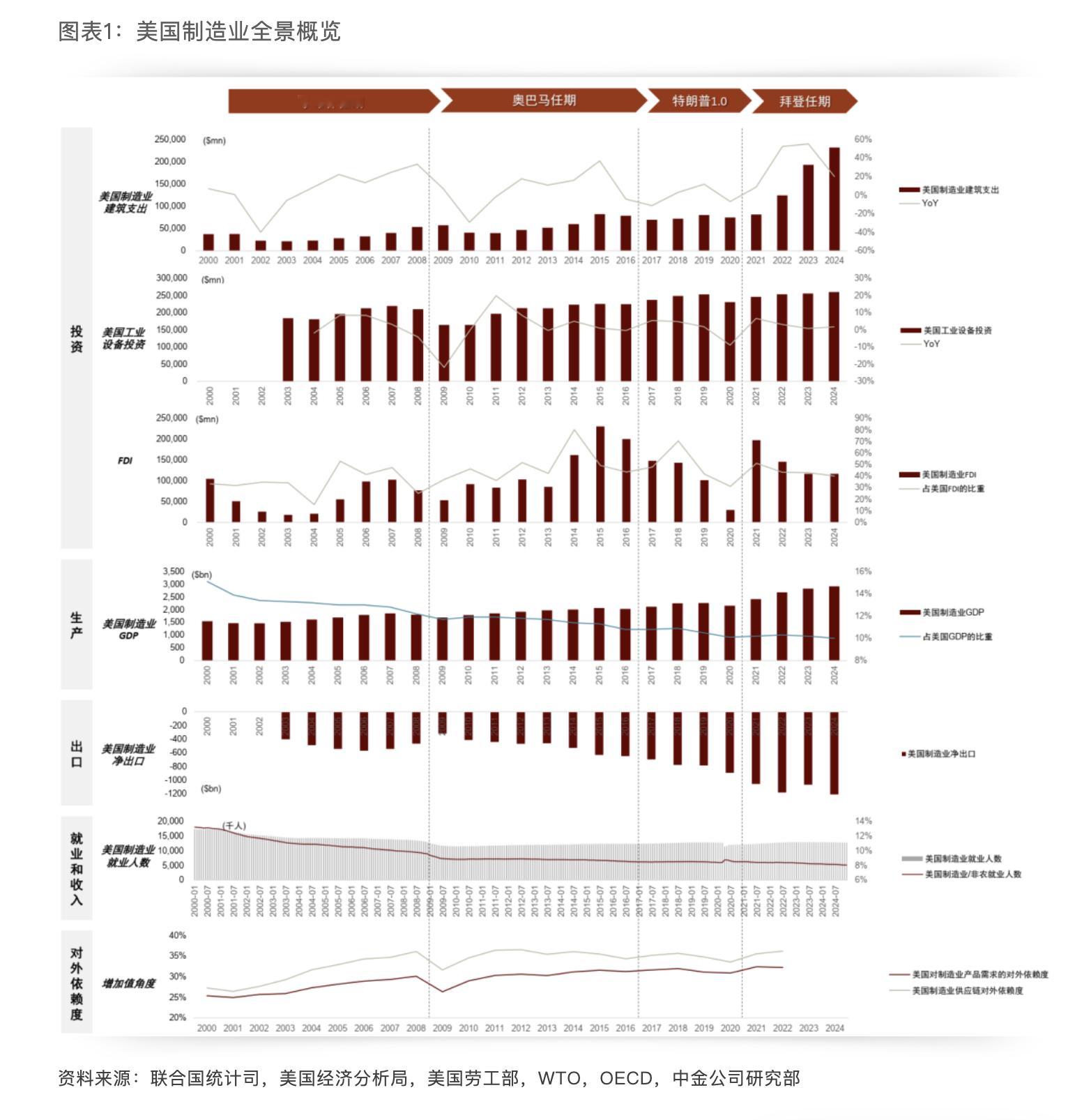 中金公司:制造业基础的结构性重塑正在发生奥巴马任期内,页岩革命带动石油煤炭行业投资,带动2014-15年化工行业投资,拜登任期内一系列补贴激励措施带动电子、电气设备、冶金回流,2021-2023年制造业建设开支明显提速。根据我们的调研,2021-2022年美国一系列补贴对产能回流的实际带动有限,主要由于当时补贴驱动下厂房项目规划先行,产能爬坡往往滞后;但企业普遍反馈看到了2025年以来关税带来的短期催化,比如在钢铁、汽车行业的本土产能利用率提升,部分欧美汽车主机厂也将部分墨西哥产线转回本土,并推进电池产能布局。