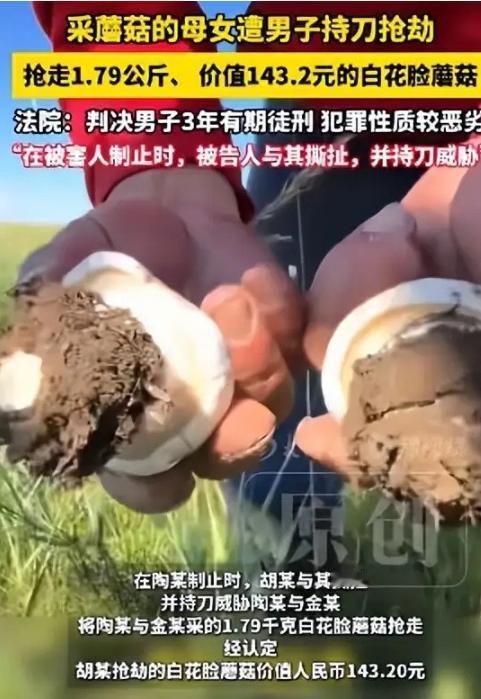 内蒙古呼伦贝尔,一女子和女儿在操场采了三斤多蘑菇,不料一男子看到后将其一把夺了过来,女子试图制止,谁知男子直接亮出了刀子,女子见状只能退却,事发后,女子越想越气和女儿采了一下午白采了,于是便报了警,结果男子被抓后被判了3年,让人无语的是,抢的蘑菇价值一般。 8月份的草场正是水草丰美的时候,连绵阴雨过后,草原上的花脸蘑冒得又多又肥,不少当地人都会趁着这时候去采点,要么自家吃,要么拿到市场上卖。 陶女士就是听邻居说这蘑菇好吃又滋补,才想着带女儿小金去碰碰运气,母女俩一大清早就钻进了草场,打算采点新鲜蘑菇回去尝尝鲜。 采蘑菇可不是件轻松活,8月的草长得又高又密,白生生的蘑菇头藏在草丛里,不仔细扒拉根本找不着。 母女俩弯着腰,一边聊天一边慢慢搜寻,从早上忙到下午,费了不少劲,总算采到了三斤多花脸蘑,装在筐里沉甸甸的,满是收获的欢喜。可谁也没料到,这份辛苦换来的成果,转眼就被人盯上了。 就在母女俩准备收拾东西回家的时候,一辆摩托车突然朝着她们这边驶来,打破了草原的宁静。骑车的是个本地男子胡某,陶女士一开始没多想,以为对方也是来采蘑菇的,毕竟这是公共草场,谁都能来。可胡某压根没停车找蘑菇的意思,反倒直接把车停在她们身边,没熄火就弯腰,一把抢过了陶女士手里的蘑菇筐。 这一下把陶女士气坏了,自己和女儿辛苦一下午才采到的蘑菇,凭什么被他说抢就抢?她压根没顾上害怕,当即就冲上去抓住胡某的摩托车,想把蘑菇抢回来,两人拉扯在了一起。旁边的女儿小金见妈妈和陌生人起了冲突,也急着要上前帮忙。 可就在这拉扯的关头,胡某突然掏出了一把亮晃晃的刀子。这一下,陶女士瞬间就懵了,原本的愤怒全被恐惧取代。她生怕刀子伤到女儿,赶紧喝止女儿别过来,自己也不敢再继续阻拦。 胡某趁着母女俩被震慑住的功夫,一脚油门踩下去,带着抢来的蘑菇筐扬长而去。 看着空荡荡的双手和远去的摩托车,陶女士又气又委屈。母女俩一下午弯腰弓背,腰酸背痛采来的蘑菇,不仅被抢走了,刚才还差点被刀子伤到,这口气怎么也咽不下去。 越想越憋屈的她,当即就拉着女儿报了警,希望能讨个公道。 警方接到报警后,很快就展开了调查,没花多久就把胡某抓获了。经过专业鉴定,胡某抢走的这筐花脸蘑,净重有1.79公斤,差不多就是三斤六两,市场价值也就143.2块钱,算不上多值钱的东西。 可谁也没想到,这起看似不起眼的抢蘑菇事件,最后的判决结果却让不少人都惊呆了,胡某被判处有期徒刑三年,还被罚了2000块钱。 很多人听说后都觉得不可思议,就抢了一百多块钱的蘑菇,怎么就判了这么重?其实这和涉案金额没多大关系,关键在于胡某的行为已经构成了抢劫罪。 法律里对抢劫罪的认定很明确,只要是使用暴力、胁迫或者其他方法抢劫公私财物,不管抢的东西值多少钱,都属于抢劫罪。胡某不仅抢夺蘑菇,还掏出刀子威胁陶女士母女,这已经是典型的持械抢劫,性质完全不一样。 哪怕他当时抢的不是这筐蘑菇,只是一分钱,只要动了刀子威胁人,最低也得判三年。而且现场还有未成年的女儿,要是陶女士没及时喝止,后果真不堪设想。这么算下来,三年刑期其实已经是法律规定的起步价了。 说起来这胡某也真是不值,有骑车找蘑菇的功夫,自己弯腰采点也能采到不少,偏偏要走歪路抢别人的。哪怕他愿意花点钱跟陶女士买,也不至于闹到坐牢的地步。 就因为一时的贪婪和冲动,为了这筐价值一百多块、顶多够吃一顿的蘑菇,把自己三年的自由搭了进去,这账怎么算都是亏到了底。现在他在牢里,就算能吃到蘑菇,估计也全是后悔的苦味。