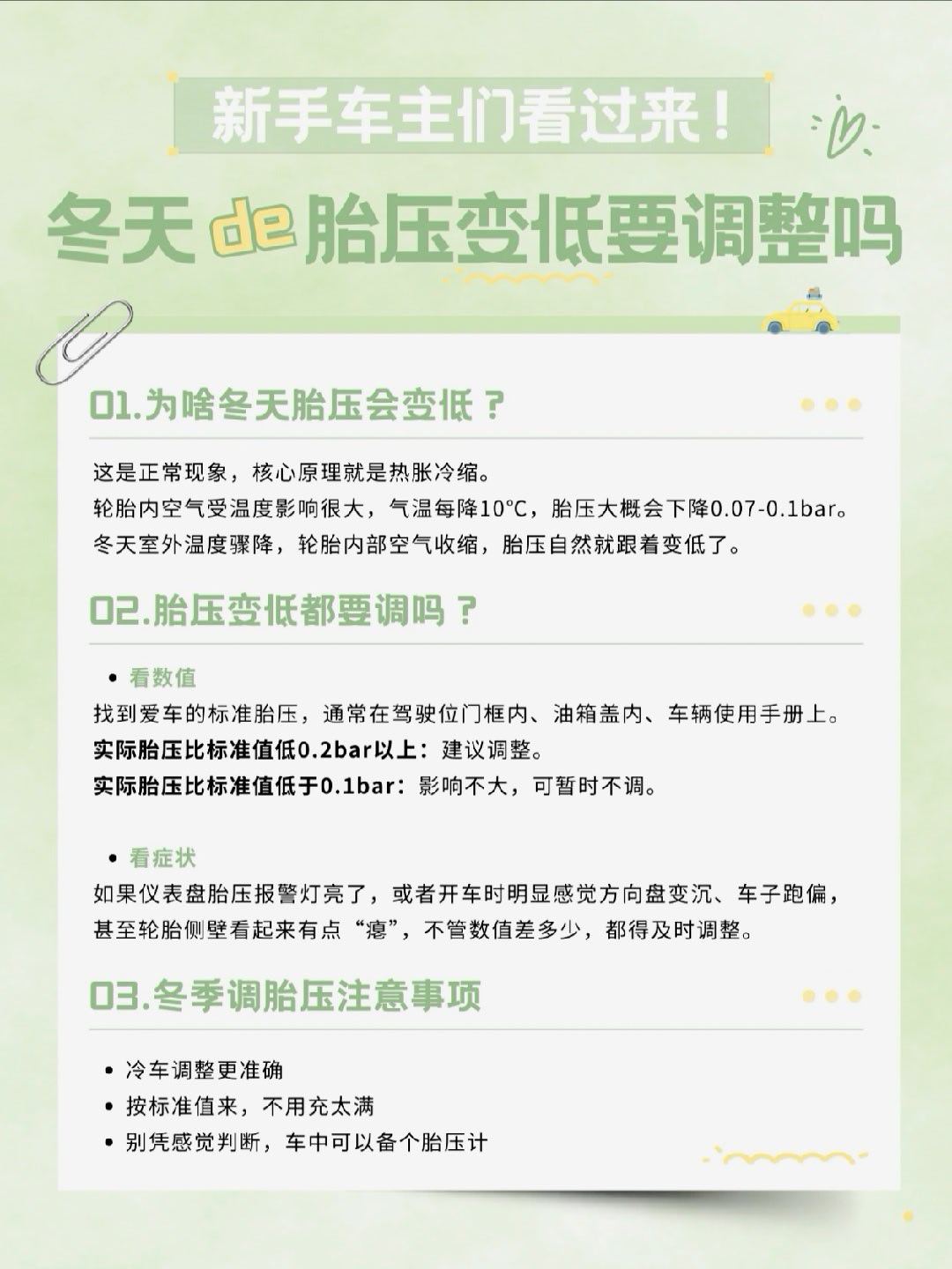 一到冬天胎压就偷偷掉?要不要补气呢?主要看两点👇🏻1️⃣看数值:低于标准值0.2bar以上再调2️⃣看症状:胎压报警灯亮、方向盘变沉或者轮胎明显瘪了,赶紧补气!出现不要慌 沉着冷静就能解决问题~我与汽车的日常大v聊车