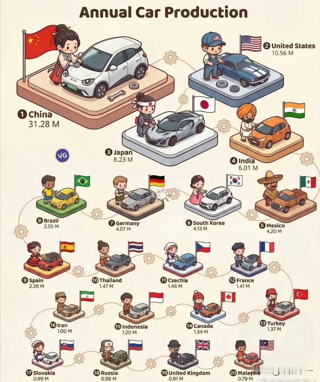世界各国的汽车产量,印度居然能排第四,是把三蹦子都算进去了吗? 中国稳稳第一,汽车产量超过第二到第五名之和,迟早将日本的汽车产业打垮,丰田估计也蹦跶不了几年了。 中国汽车产销量