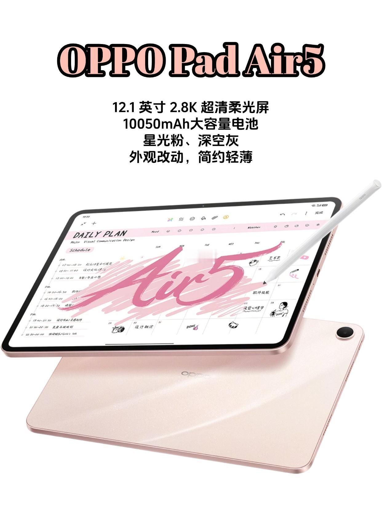不懂就问,学生选OPPO Pad Air5还是Pad5? 最近新款OPPO Pad Air5公布,给不少学生党看纠结了,不知道要选新款还是之前发布的OPPO Pad5,汇总了一波目前的爆料,感觉这两款差别蛮大的。 新款OPPO Pad Air5外观质感比Air2好不少,整体轻薄手感好,方便随身携带,而且还有柔光屏,学习看笔记更护眼,10050mAh超大电池续航也够一天的外出使用 OPPO Pad5也是既有柔光屏又有大电池,但它性能会更好一点,不仅适合学习,打游戏体验也会更好一些,当然了,价格也会比Air5高一点 所以预算到位的可以直接冲OPPO Pad5,兼顾游戏和学习。主要想学习的,对颜值和手感有一定要求,追求性价比的可以选OPPO Pad Air5,大家觉得呢?