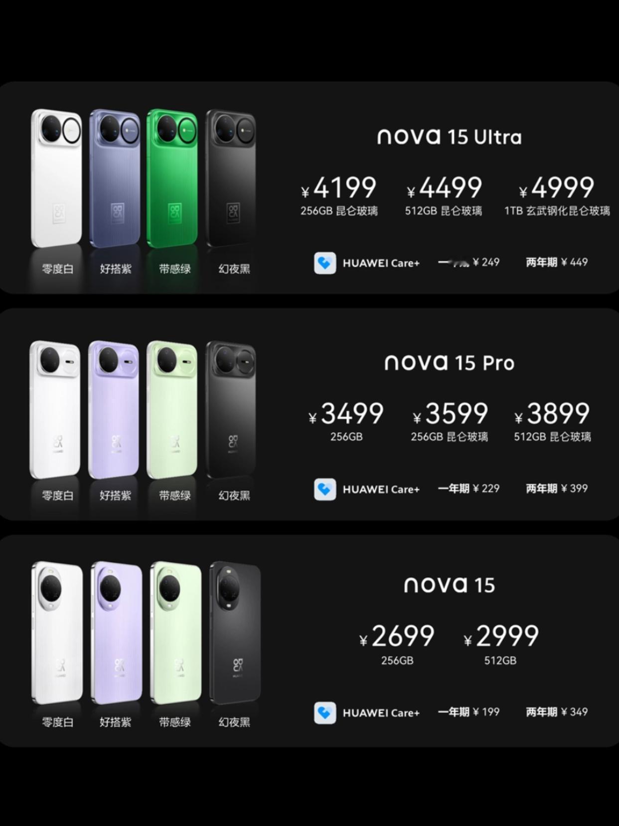 华为nova15系列整理好了,这不得卖爆? 就在刚刚,华为nova15系列重磅登场,大家觉得值不值得入? nova15:2699起 nova15 Pro:3499起 nova15 Ultra:4199起 华为中端机感觉是越来越大胆了,这代的外观设计就很有看点,影像配置也不错,2699起解锁易烊千玺同款,有没有打算入首发的?
