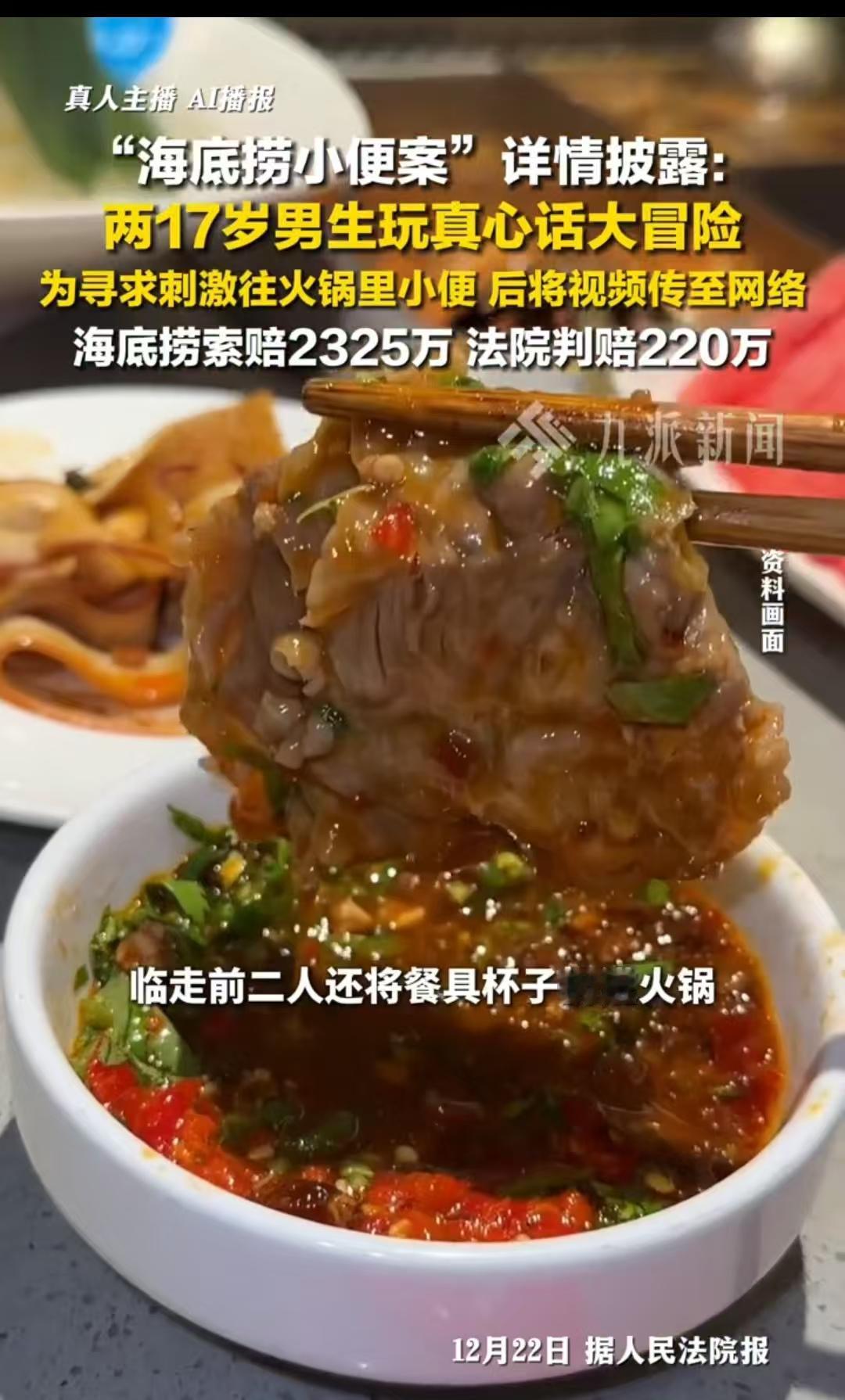 “一泡尿”赔220万! 上海,两名17岁少年在海底捞玩真心话大冒险,朝火锅小便并拍视频传播,警方以寻衅滋事对其行政拘留。海底捞索赔2325万元,法院判令监护人赔偿220万元,12月官媒解读该案,引发全网热议。 法院判决书上的220万,像块大石头,狠狠砸在唐某父亲的心上。这笔钱,是他和吴某家长要为两个17岁少年的糊涂事买单,而这事的起因,不过是一场变味的真心话大冒险。 2025年2月的一个凌晨,上海捞得乐火锅店的包间里,唐某和吴某酒过三巡,玩起了真心话大冒险。 当屏幕跳出“往火锅里小便”的指令时,在同伴的起哄下,唐某脑子一热照做,吴某则拿着手机全程拍摄。 两人只顾着嬉笑取乐,丝毫没留意包间里的监控,更没料到三天后这段视频被发上朋友圈,迅速在全网传播开来。 这段视频引发网友震怒,也让捞得乐火锅店遭受重创。门店订餐电话被骂声和退订请求打爆,往日排队等位的盛况彻底消失,连周边店铺的生意都受到波及。 店长紧急组织员工对涉事包间进行彻底清洁,更换了所有餐具、桌椅,却依旧洗不掉“卫生堪忧”的标签。 涉事时段的4109位顾客纷纷要求退款,门店仅“退一赔十”就支出近百万,再加上客流量暴跌带来的经营损失,火锅店直接将唐某、吴某及其监护人告上法庭,索赔2325万元。 唐某父亲在派出所见到儿子时,少年早已没了往日的嚣张,只剩满脸慌乱。 直到这时,他才意识到自己平日里只关注儿子的成绩,却从未教过他何为公德、何为法律,总觉得17岁孩子的调皮无伤大雅,殊不知这份放任早已让儿子越过了底线。 庭审现场,火锅店律师逐一罗列各项损失,法官则明确释法:未成年人实施侵权行为,由其监护人承担民事责任。 唐某父亲看着店长泛红的眼眶,想到自己半辈子积攒的家底,只觉悔恨不已。 最终法院判决,唐某、吴某需公开道歉,两人的监护人共同赔偿220万元。 唐某父亲只能东拼西凑,将赔偿款交付法院,再由法院依法将款项转付给火锅店。 这场闹剧,以两个家庭付出沉重的经济代价收场,也给所有家长敲响了警钟:别把孩子的胡闹当玩笑,任何出格的行为,都要付出实实在在的代价。 1、 捞得乐火锅店提起民事诉讼,主张唐某、吴某向火锅内小便并传播视频的行为侵害门店财产权与名誉权,该行为已构成民事侵权 。 民事侵权是指行为人因过错侵害他人民事权益,依法应承担赔偿损失、赔礼道歉等民事责任的行为。 唐某、吴某共同故意实施上述行为,主观过错明显,客观上造成门店餐具污染、清洗消毒及经营损失,视频传播严重损害品牌商誉,行为与损害后果直接关联,完全满足民事侵权构成要件 。 2、 一审中,法院判决唐某、吴某的监护人承担侵权责任,赔偿捞得乐火锅店各项损失共计220万元,且唐某、吴某需公开赔礼道歉 。 《民法典》第1188条规定,无民事行为能力人、限制民事行为能力人造成他人损害的,由监护人承担侵权责任;监护人尽到监护职责的,可以减轻其侵权责任。 17岁的唐某、吴某尚未成年,属于限制民事行为能力人,无独立承担全部经济赔偿的能力,故判决由其监护人兜底赔付;同时两人需承担公开赔礼道歉的非财产性责任,以实现教育惩戒目的 。 当然捞得乐火锅店若对赔偿金额不满意,或者唐某、吴某的监护人不认可判决结果,均可提起上诉。 对于此事,大家如何看?素材来源于九派新闻 2025-12-22