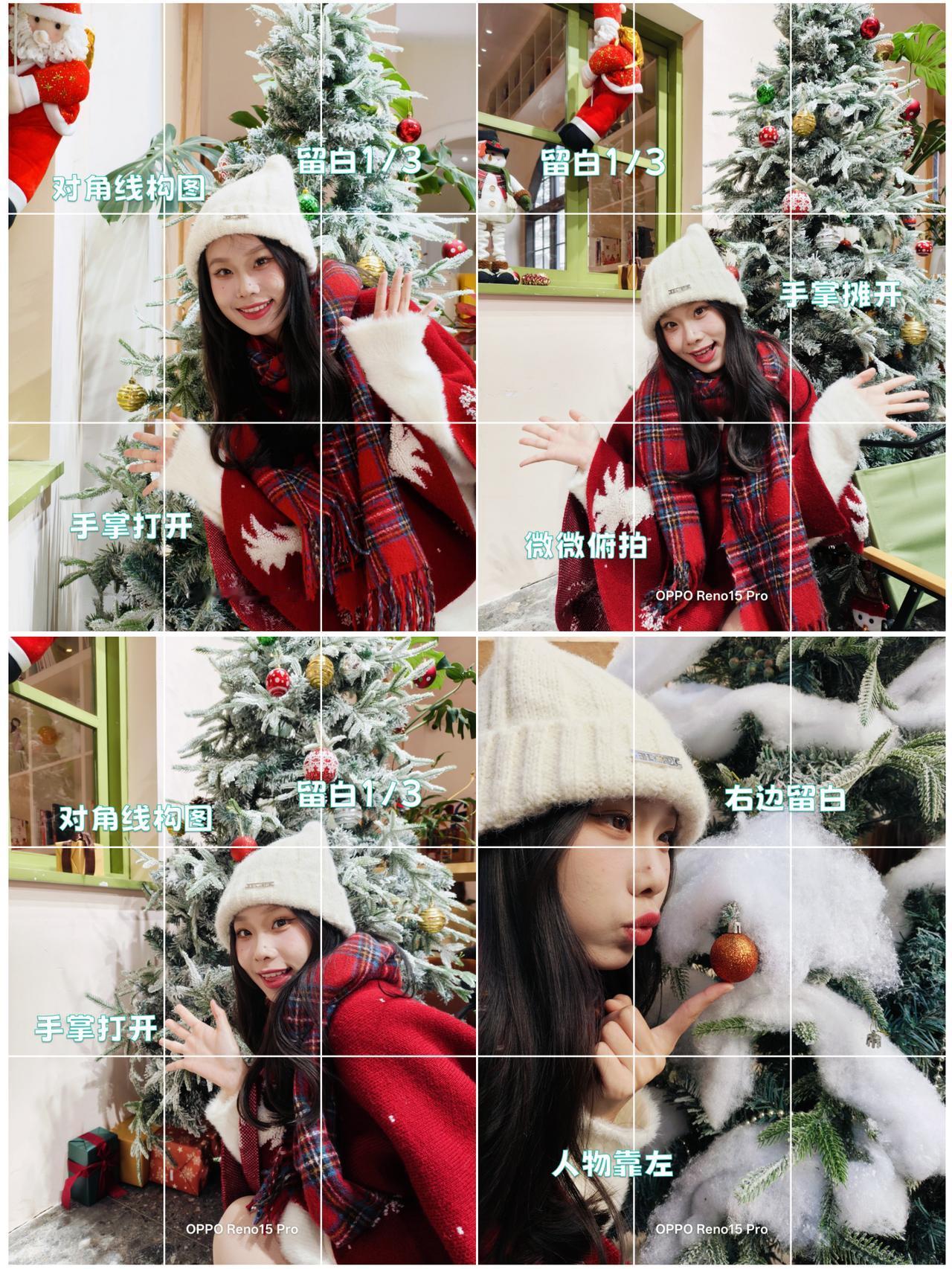 🎄圣诞拍照万能公式!附教程~ 最近在🍠刷了一圈圣诞拍照教程,发现大家的套路真的很统一,但确实好用! 提前帮你们总结了一套,直接照着拍就行👇 图2-3:对角线构图,脸的位置处于九宫格中间靠上位置,手掌打开→背景怼个圣诞树 图4:微微俯拍构图,背景留白1/3,双手自然伸展开,眼神看镜头下方 图5:和圣诞装饰贴贴→ 对着圣诞花环、小彩灯凑近拍,单手比耶或托腮,利用装饰挡部分脸,显脸小还可爱 ✨ 加分小技巧: 穿浅色系毛衣 / 围巾,和红色圣诞元素撞色超出片; 拍照时还可以让朋友开闪光灯,拍出来更有氛围感~ 对于在用OPPO Reno15系列的用户,用CCD闪光实况功能来拍再适合不过了 另外Reno15主摄2亿像素镜头可以捕捉更多细节,构图裁切更方便 而且拍完还可以通过出圈实况拼图功能 将几张live拼起来搞“出圈”效果,直接秒杀静态九宫格~ 难怪这手机首销三周出货量超200万,过半都是年轻用户买单~ 原来影像玩法那么丰富! 圣诞拍照教程 素人圣诞拍照 Reno15Pro 出圈实况拼图 圣诞氛围感拍照 手机拍照技巧 OPPO