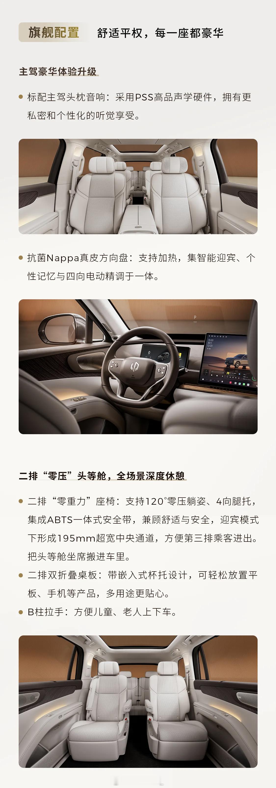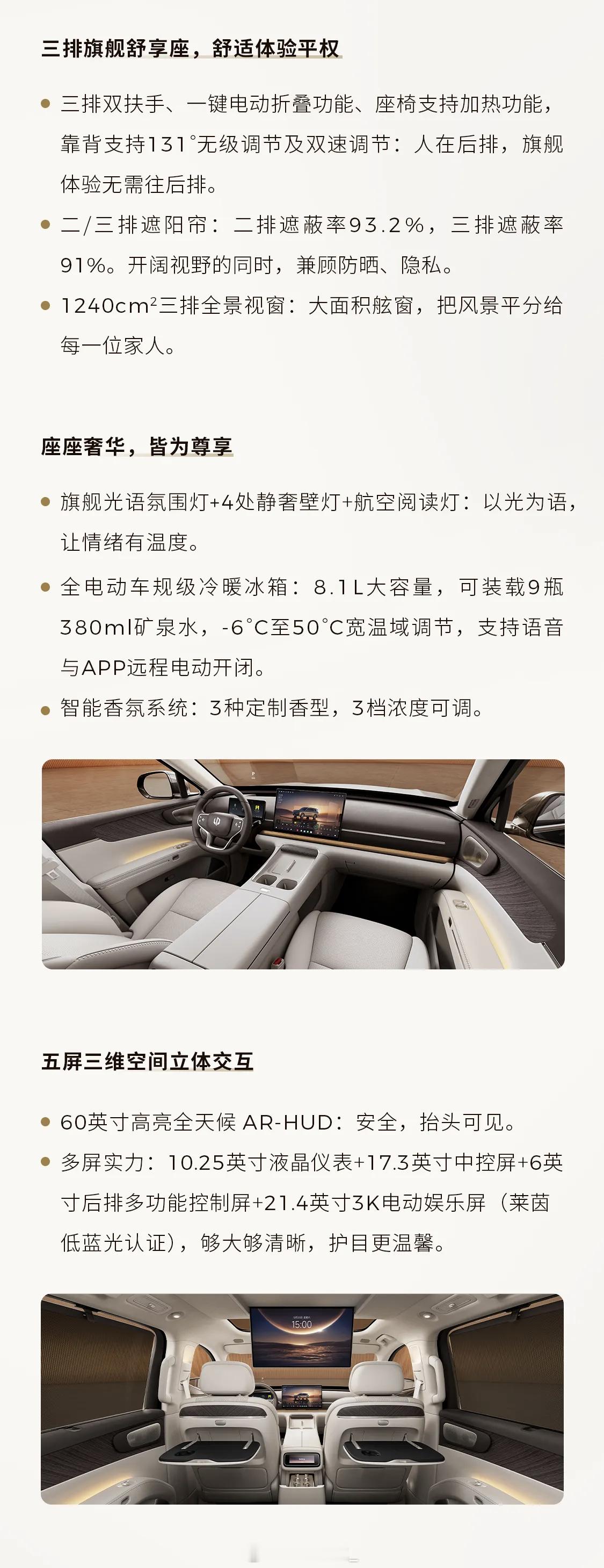 零跑 D19 新的内饰细节:这次皮质用料应该比较狠,并且也有大范围的软包覆盖,有绒顶可以选。配有头枕音响。二排右侧带有零重力,安全带集成在座椅上,迎宾模式下形成一个大通道方便进出。带有双小桌板,这个比较好评。一个比较创新的设计,三排也有独立扶手,扶手可以完全隐藏在坐垫里,需要的时候可以放下来。三排座椅靠背有 131 度可调,也支持电动折叠。带有最低 -6 度的压缩机冰箱。60 英寸 的 AR-HUD ,也有21.4英寸,也是目前最新大尺寸的后排屏,并且后排还带有一个 6 英寸的小控制屏。零跑新的家族化设计,明显是向上作为旗舰产品亮相,大家觉得怎么样?零跑d19零跑汽车