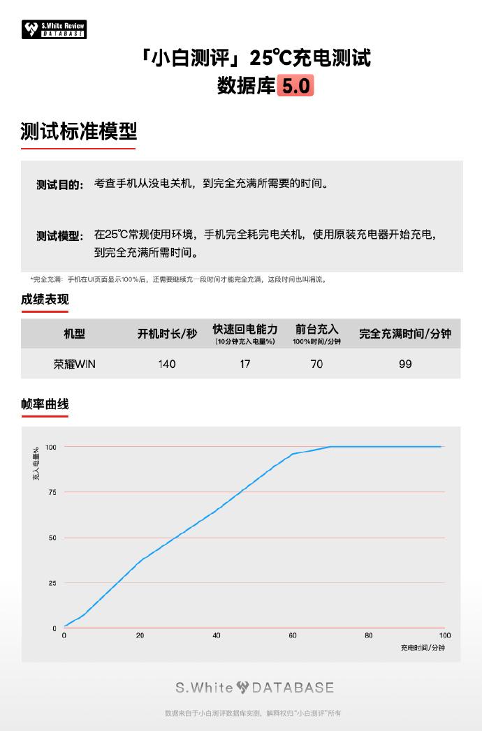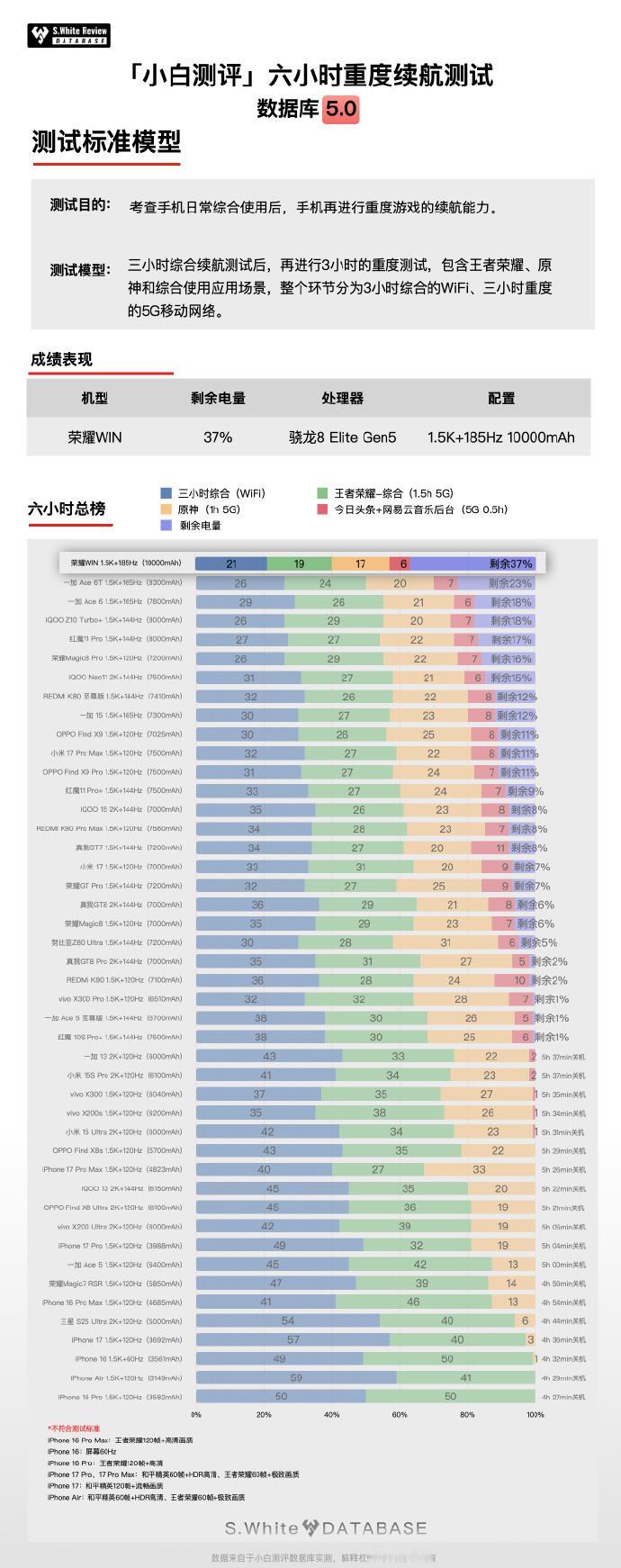 谁懂啊!常规手机电池居然干到 10000mAh 了?! 这可是以前只有充电宝才敢想的容量!现在直接焊在了荣耀 WIN 系列手机里!就问你猛不猛? 我直接蹲了小白测评的实测数据,荣耀 WIN 和荣耀 WIN RT 这俩兄弟的续航表现,直接干翻了所有机型,俩机子续航几乎没差,都是狠角色: 三小时综合续航测完,还剩 79% 的电 六小时重度造(还开着 120Hz 高刷),居然还能剩 37% 极限续航直接干到关机,硬扛了 10 小时 2 分钟! 而且这个测试是全程亮屏的,日常用的应用刷后台、切 APP、留后台,再加负载拉满的打游戏场景全给测了个遍,10000mAh 的大电池真的是把续航安全感拉满,这收益肉眼可见的离谱! 再说说充电:25℃的标准环境下用 100W 原装充电器测的 10 分钟直接回血 17%,70 分钟前台直接干到 100%,99 分钟彻底充满,速度也没因为大电池打折扣! 就这续航 + 充电的组合,荣耀 WIN 系列这波直接把手机续航的天花板抬了一档啊!