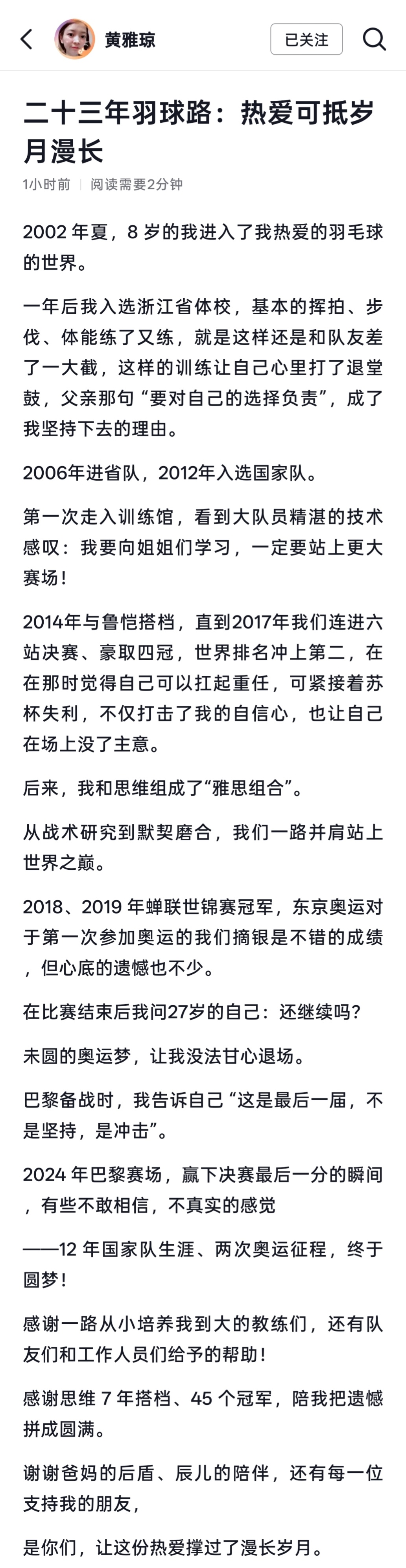 黄雅琼🎵更新文章:【二十三年羽球路:热爱可抵岁月漫长】2002年夏,8岁的我进入了我热爱的羽毛球的世界。一年后我入选浙江省体校,基本的挥拍、步伐、体能练了又练,就是这样还是和队友差了一大截,这样的训练让自己心里打了退堂鼓,父亲那句“要对自己的选择负责”,成了我坚持下去的理由。2006年进省队,2012年入选国家队。第一次走入训练馆,看到大队员精湛的技术感叹:我要向姐姐们学习,一定要站上更大赛场! 2014年与鲁恺搭档,直到2017年我们连进六站决赛、豪取四冠,世界排名冲上第二,在在那时觉得自己可以扛起重任,可紧接着苏杯失利,不仅打击了我的自信心,也让自己在场上没了主意。后来,我和思维组成了“雅思组合”。从战术研究到默契磨合,我们一路并肩站上世界之巅。2018、2019年蝉联世锦赛冠军,东京奥运对于第一次参加奥运的我们摘银是不错的成绩但心底的遗憾也不少。在比赛结束后我问27岁的自己:还继续吗? 未圆的奥运梦,让我没法甘心退场。巴黎备战时,我告诉自己“这是最后一届,不是坚持,是冲击”。2024 年巴黎赛场,赢下决赛最后一分的瞬间有些不敢相信,不真实的感觉——12年国家队生涯、两次奥运征程,终于圆梦! 感谢一路从小培养我到大的教练们,还有队友们和工作人员们给予的帮助!感谢思维7年搭档、45个冠军,陪我把遗憾拼成圆满。谢谢爸妈的后盾、辰儿的陪伴,还有每一位支持我的朋友,是你们,让这份热爱撑过了漫长岁月。