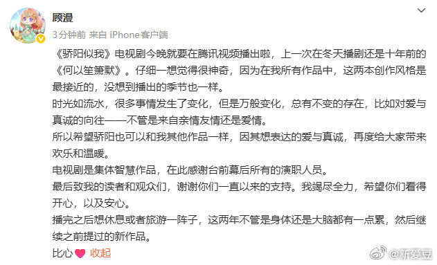 顾漫回应骄阳似我播出顾漫发文庆祝骄阳似我播出顾漫发文庆祝《骄阳似我》播出!