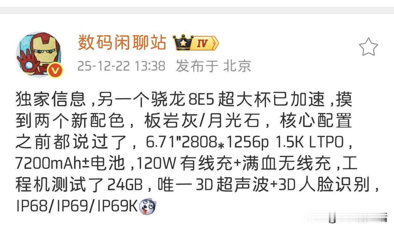 荣耀Magic8 RSR曝光:唯一3D超声波+3D人脸识别! 今日,知名数码博主“数码闲聊站”爆料了一款骁龙8E5超大杯新机,据猜测或为荣耀Magic8 RSR保时捷版。 据爆料,该机已加速,有板岩灰/月光石两个新配色,核心配置方面,采用6.71英寸的2808*1256P 1.5K LTPO屏幕,内置7200mAh±电池,支持120W有线充+满血无线充电器,工程机测试了24GB内存,唯一3D超声波+3D人脸识别,IP68/IP69/IP69K满级防尘防水。荣耀magic8rsr 荣耀Magic8 RSR